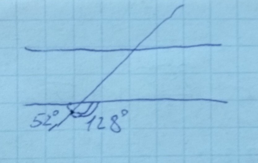 Угол не может быть равен 52°, если он пересечен параллельной прямой, потому что это будет 90°