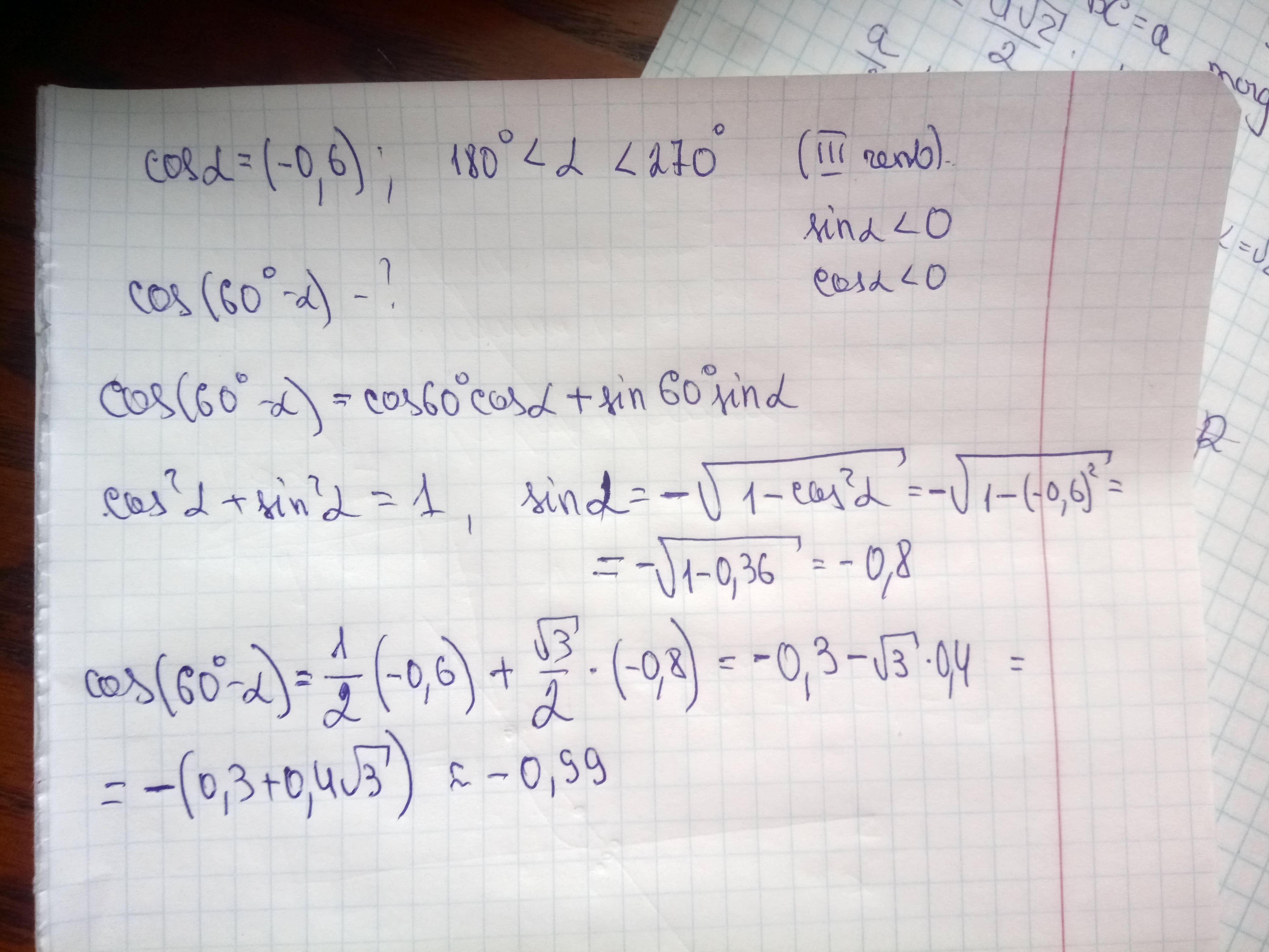 имеем,cos(60°-α)= - 0,3+√3/2·(-0,8)= -0,3-0,4√3.