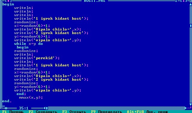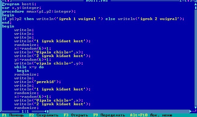 Игра в кости, 2 игрока, кости с 6 гранями. Если выиграл какой то игрок, то это выводится на экран, если ничья , то кидают ещё раз. И выводим на экран кто выиграл. ( решается в Паскале ABC)