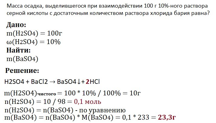 Масса осадка, выделившегося при взаимодействии 100 г 10%-ного раствора серной кислоты с достаточным количеством раствора хлорида бария равна? Распишите подробно, Дано, Найти, Решение. Заранее спасибо!