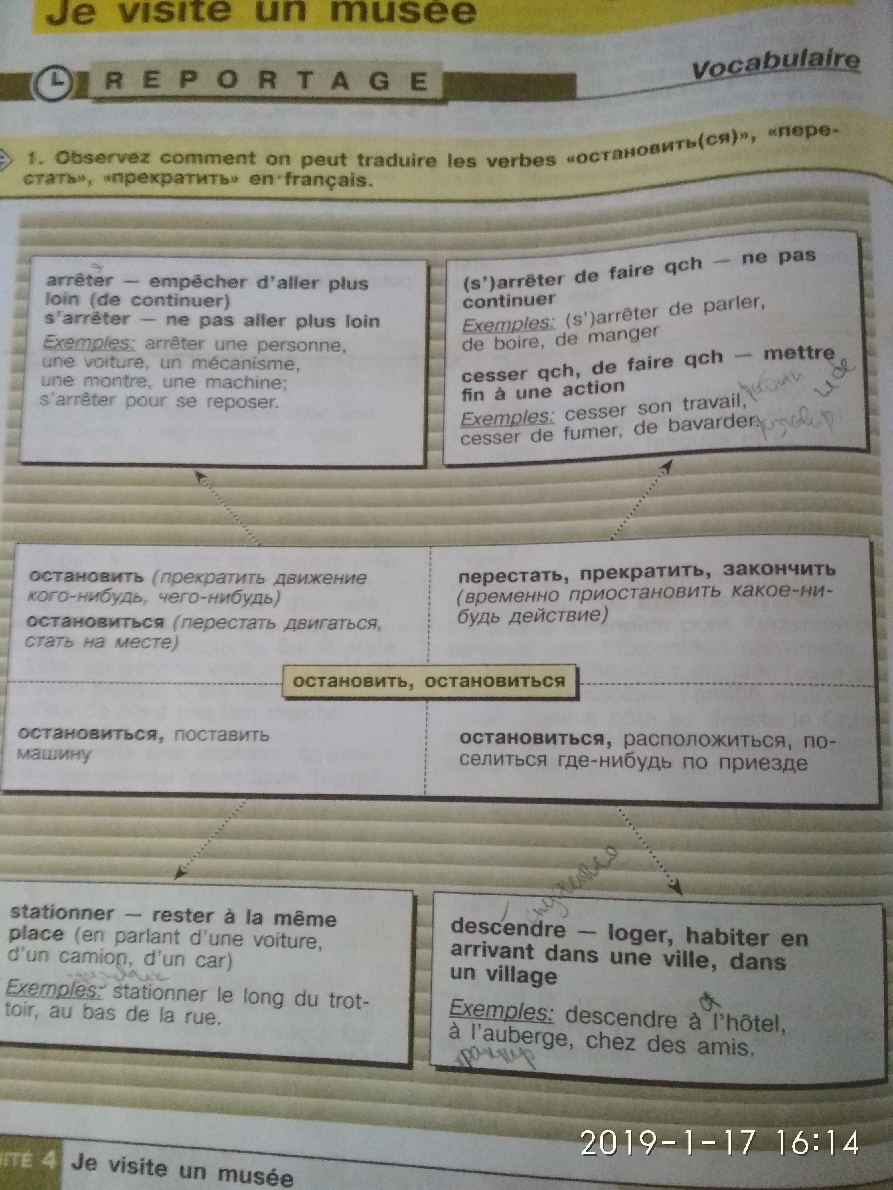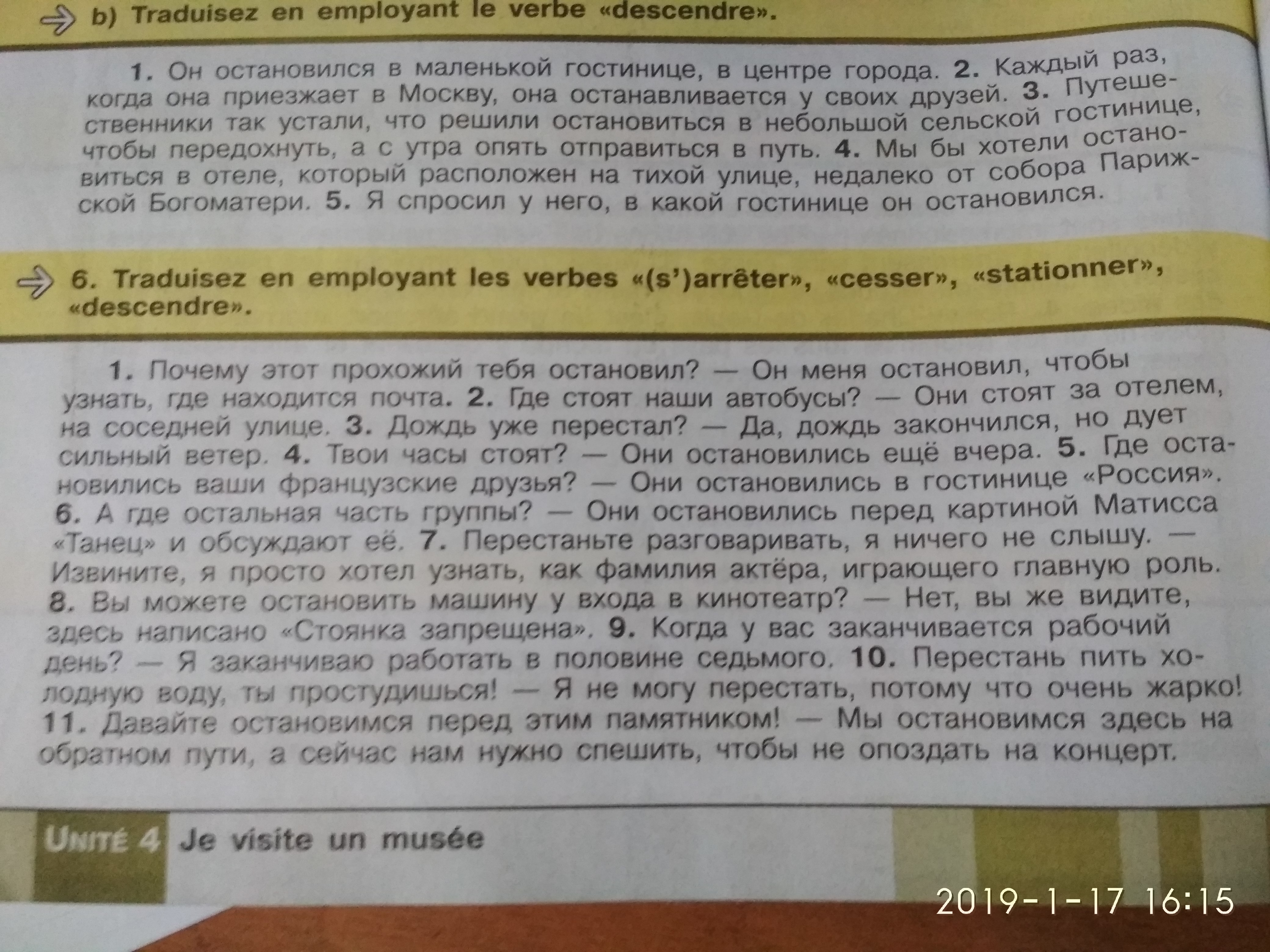 1.Pourquoi ce passant t'a arrêté? - Il m'a arrêté pour savoir où se trouvait le poste.2. Où stationnent nos bus? - Ils stationnent derrière l'hôtel, dans une rue voisine. 3. La pluie s'est déjà arrêtée de tomber? - Oui, la pluie est terminée, mais le vent fort souffle. 4. Ta montre s'est arrêtée? - Elle se sont arrêtés hier. 5. Où sont descendu vos amis français? - Ils sont descendu à l'hôtel "Russie". 6. Et ou est le reste du groupe? - Ils se sont arrêtés devant le tableau "La Danse" de Matisse et en discutent. 7. Cessez de parler, je n'entends rien! - Je suis désolé, je voulais juste savoir comment le nom de l'acteur qui joue le rôle principal. 8. Pouvez-vous stationner la voiture à l'entrée du cinéma? - Non, vous voyez, il est écrit "Le parking est interdit". 9. Quand s'arrête votre journée de travail? - Je m'arrête le travailler à six heures et demie. 10. Cesse de boire de l'eau froide, tu attrapere un rhume! - Je ne peux pas cesser de boire parce que il fait très chaud! 11. Arrêtons-nous devant ce monument! - Nous nous arrêtons ici sur le chemin du retour, et maintenant nous devons nous dépecher que de ne pas être en retard pour le concert.