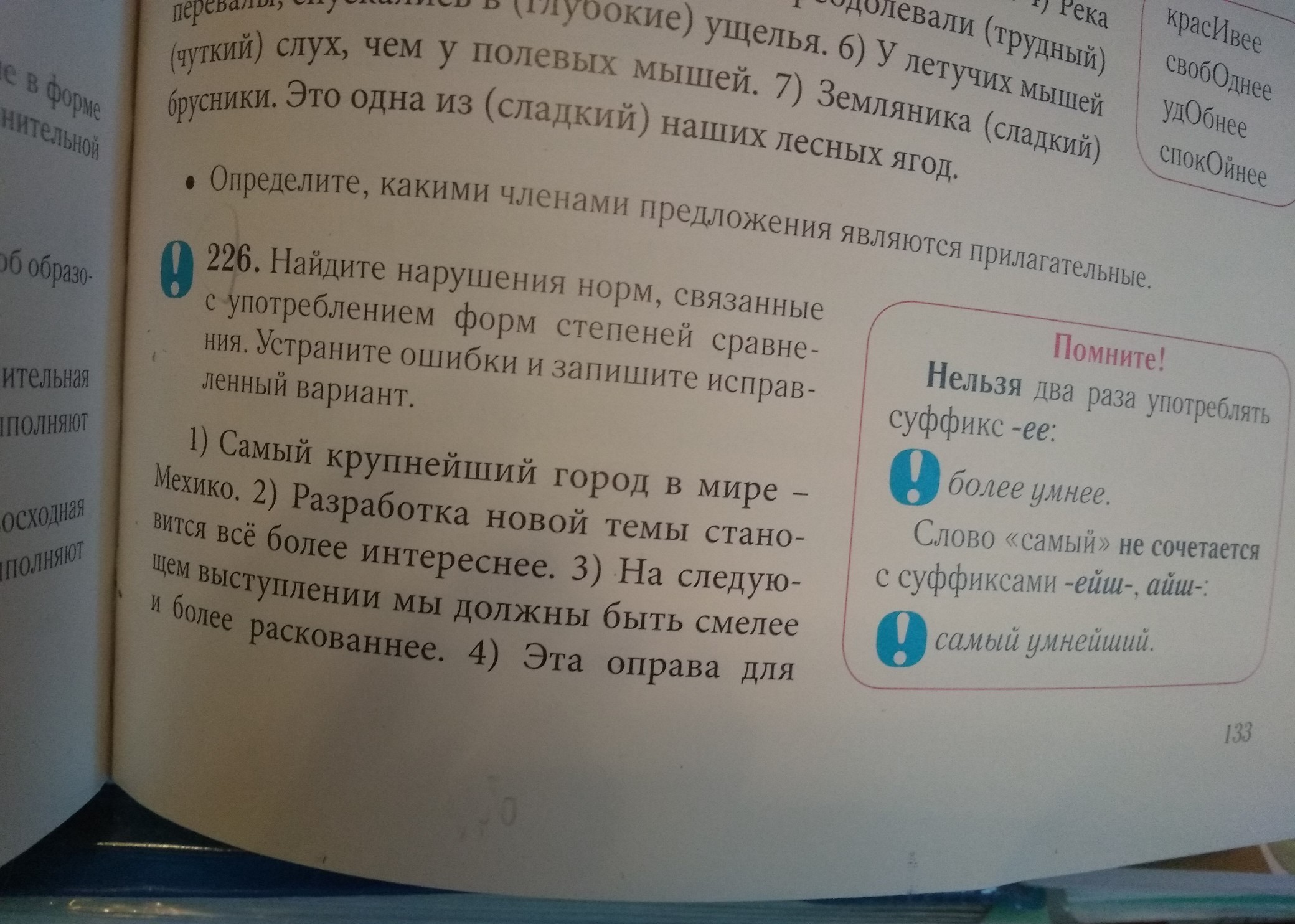 1) самый крупный город в мире—Мехико. 2) разработка новой темыстановится всё более интересной. 3) на следующем выступлении мы должны быть смелее и более раскованными.