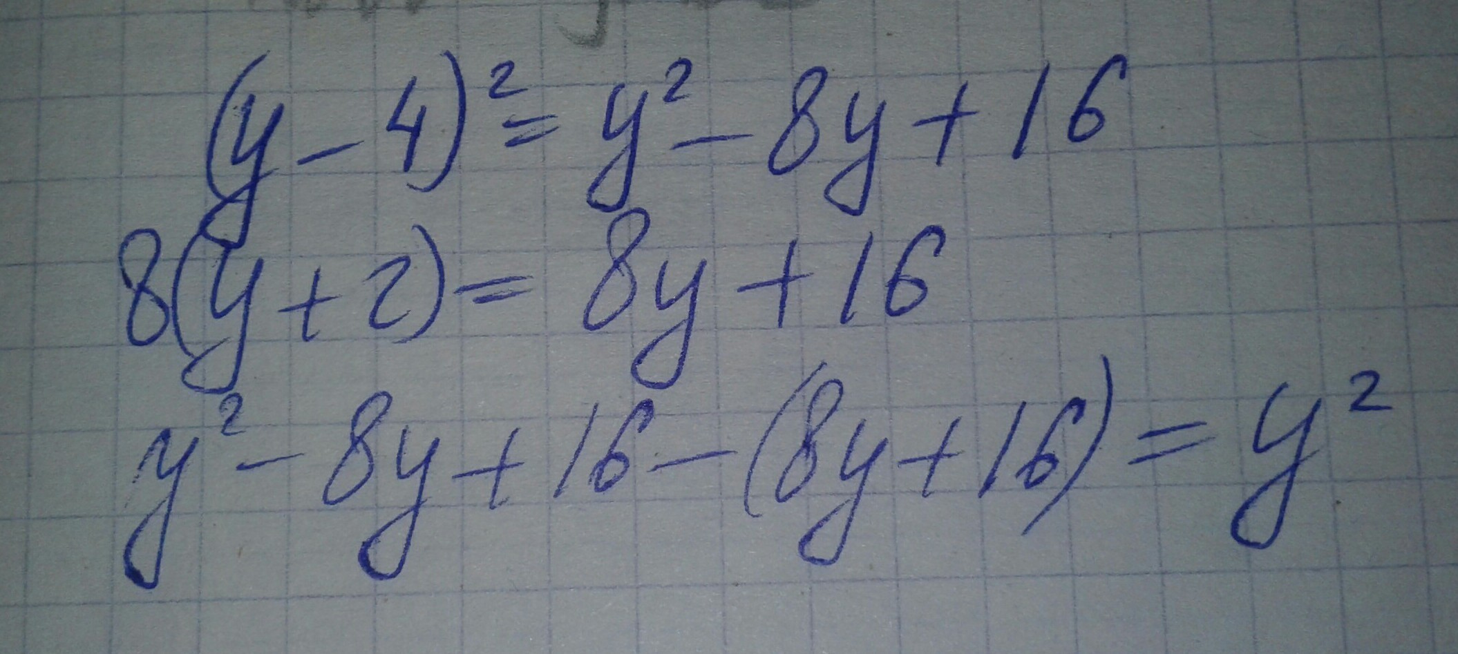 (у-4)в квадрате - (у+2)*8=у в квадрате-4 в квадрате-(у*8+2*8)=у в квадрате-16-8у+16=у*у - 8у