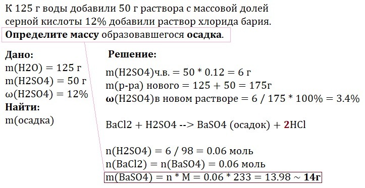 К 125 г воды добавили 50 г раствора с массовой долей серной кислоты 12% добавили раствор хлорида бария .определите массу образовавшегося осадка