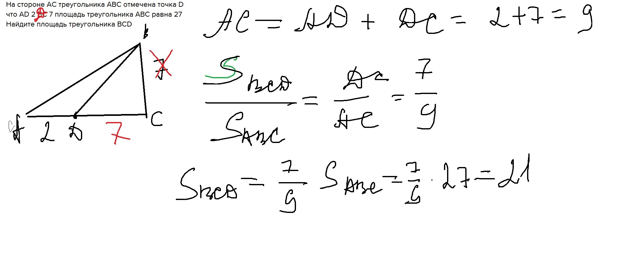 на стороне AC треугольника ABC отмечена точка D что AD 2 BC 7 площадь треугольника ABC равна 27 Найдите площадь треугольника BCD