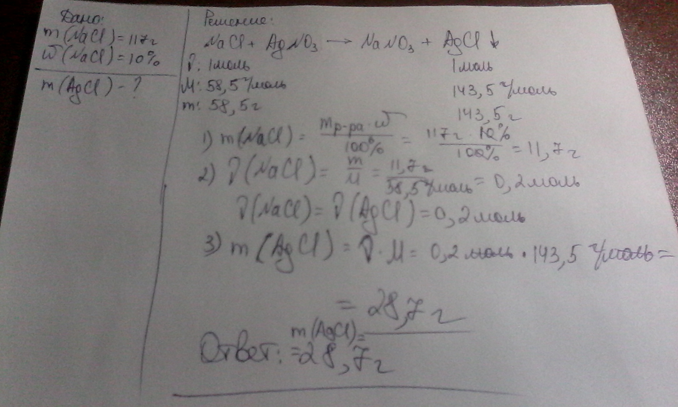 какова масса осадка образованного при взаимодействии 117 г хлорида натрия с массовой долей 10 процентов с нитратом серебра?