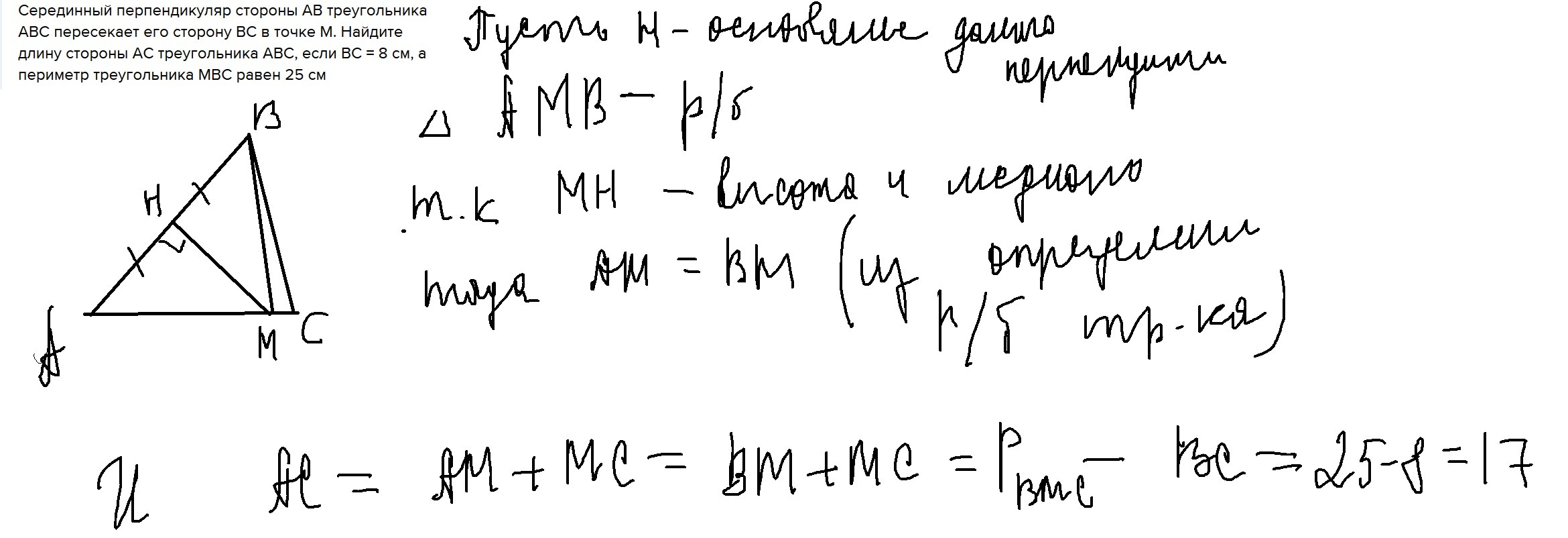 Серединный перпендикуляр стороны AB треугольника ABC пересекает его сторону BC в точке M. Найдите длину стороны AC треугольника ABC, если BC = 8 см, а периметр треугольника MBC равен 25 см