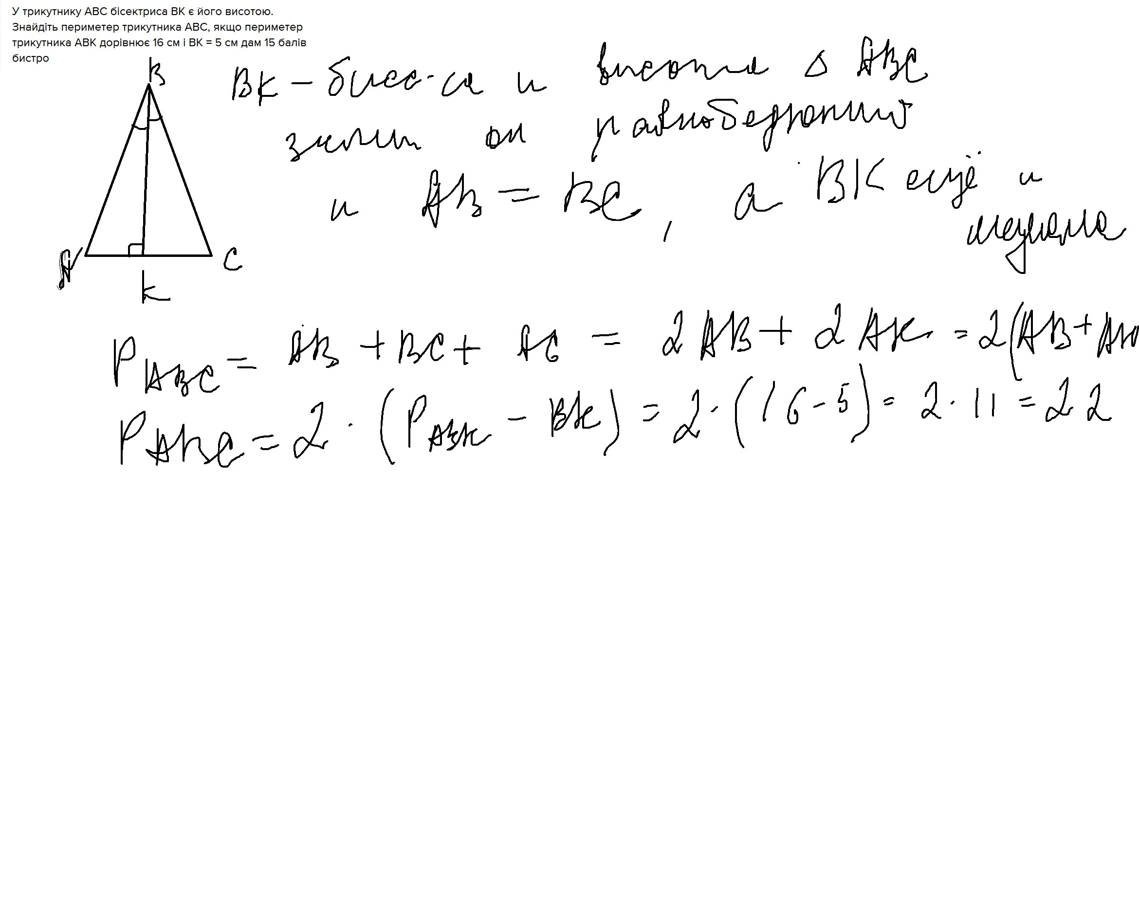 У трикутнику АВС бісектриса ВК є його висотою. Знайдіть периметер трикутника АВС, якщо периметер трикутника АВК дорівнює 16 см і ВК = 5 см дам 15 балів бистро пж Спасібо