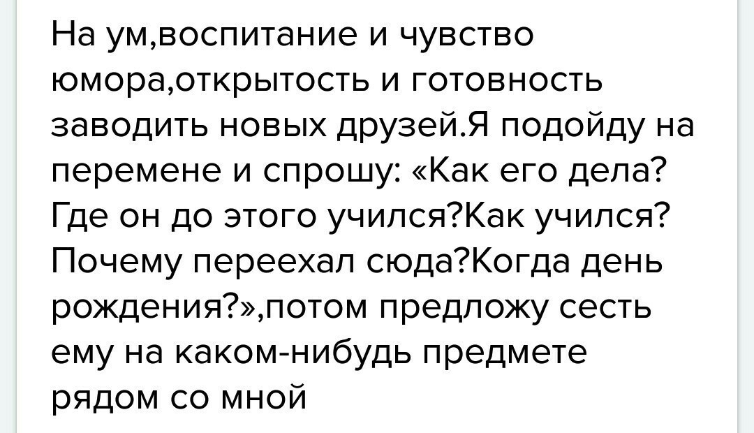 На ум,воспитание и чувство юмора,открытость и готовность заводить новых друзей.Я подойду на перемене и спрошу: «Как его дела?Где он до этого учился?Как учился?Почему переехал сюда?Когда день рождения?»,потом предложу сесть ему на каком-нибудь предмете рядом со мной
