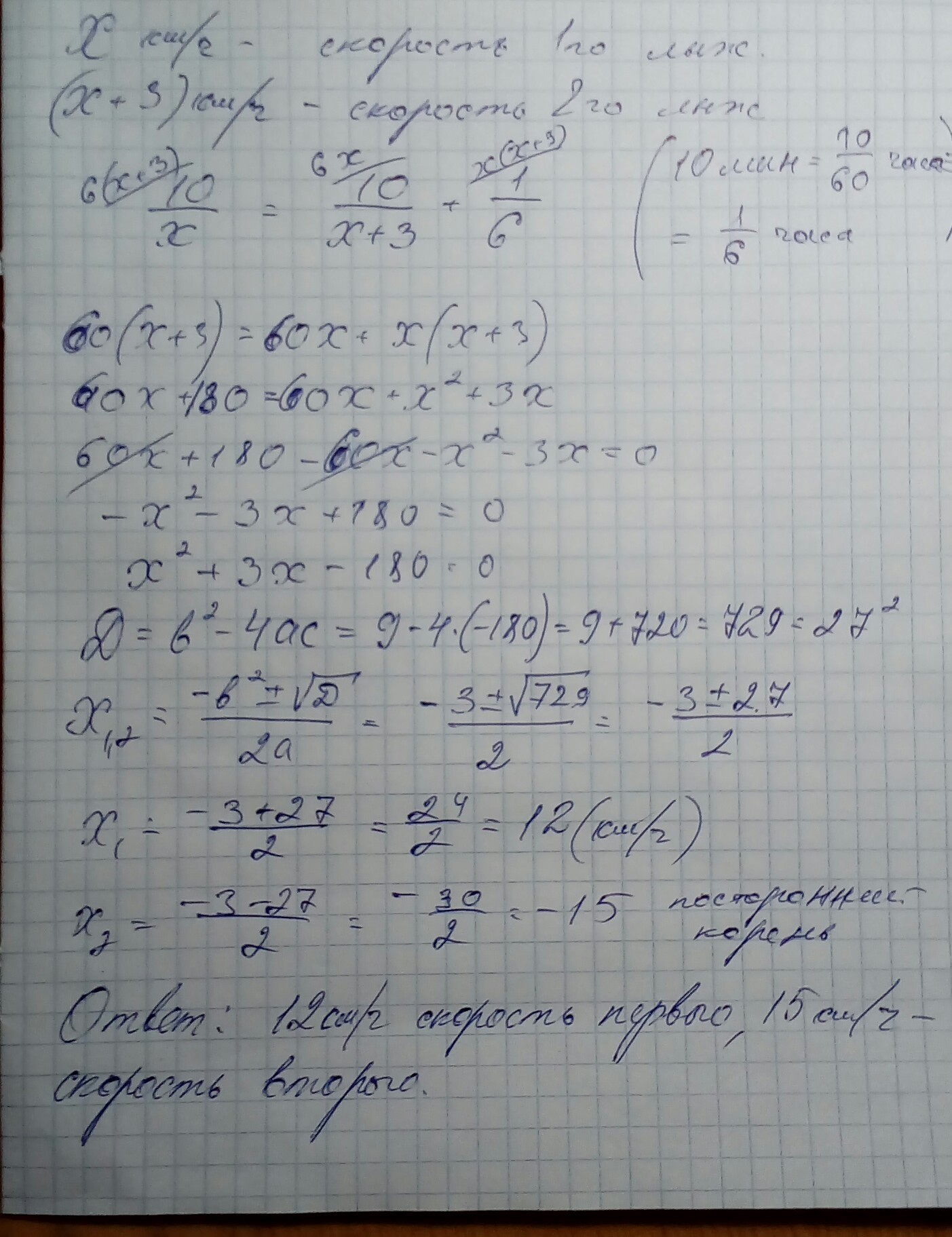 Расстояние в 10 км один из двух лыжников прошел на 10 минут быстрее другого. Скорость первого лыжника была на 3 км/ч больше скорости второго. Какова скорость каждого лыжника?