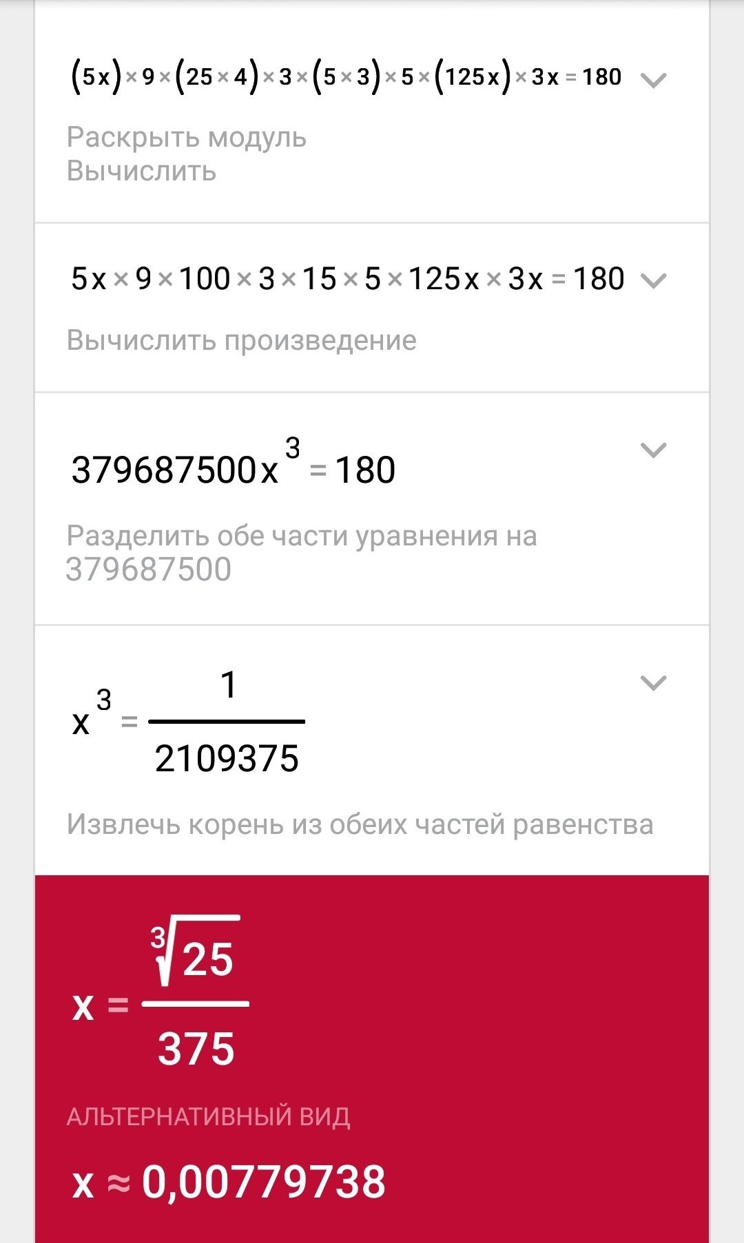 Реши уравнение (5x)9⋅(25x4)3(5x3)5⋅(125x)3⋅x=180 Ответ: (записывай сначала положительный корень)