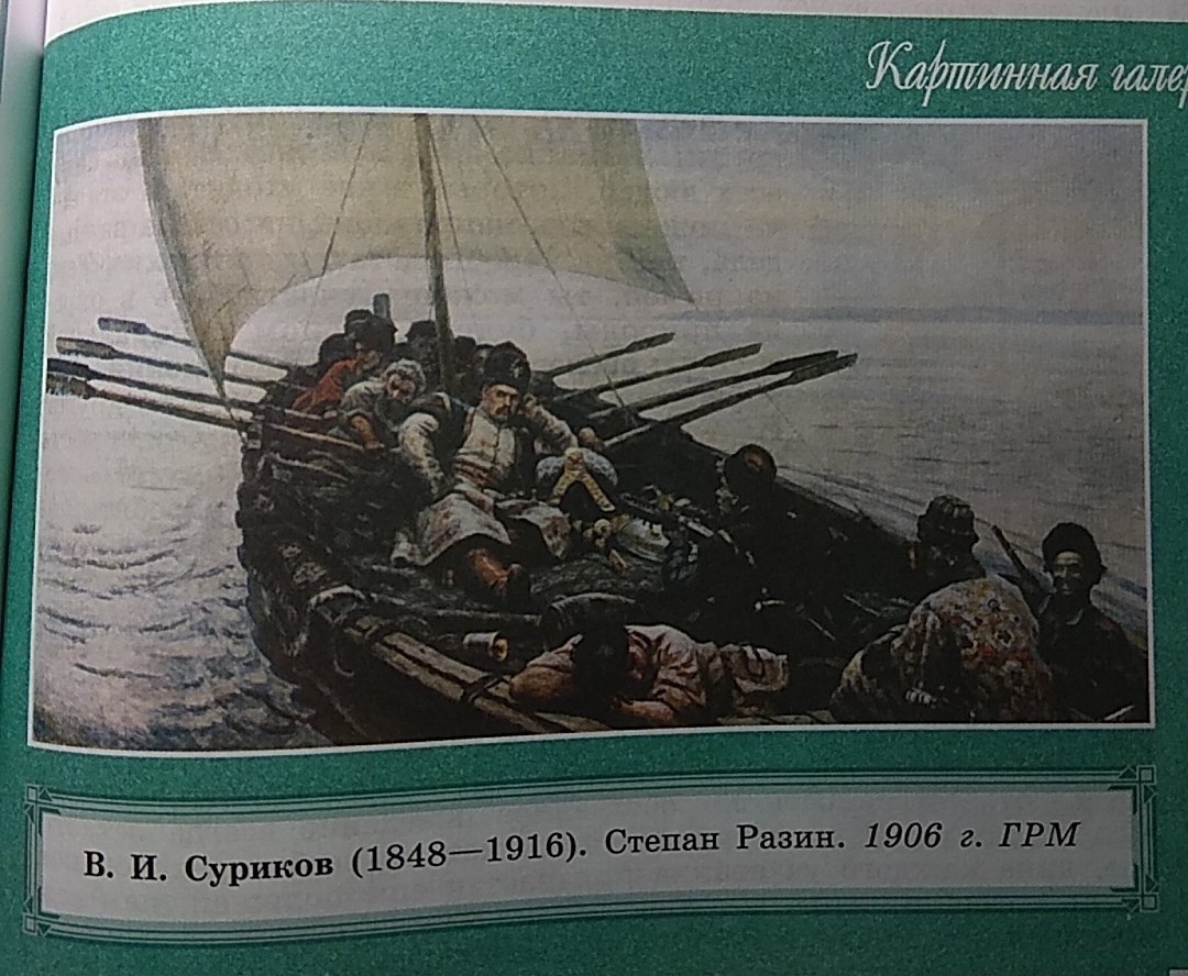 Картина Василия Сурикова «Степан Разин». Холст, масло. Картина «Степан Разин» — еще один исторический экскурс в далекое прошлое Руси. По бескрайним волжским просторам плывет струг с атаманом и его вольной дружиной. Взлетают над водой весла, казаки бражничают и веселятся, и только Разин погружен в глубокую думу. О чем? Как сделать русский народ вольным и счастливым? Или о судьбах верных сподвижников: куда он приведет их? А быть может, тоскует грозный атаман по персидской княжне? Каждый зритель, обладающий фантазией и склонный к романтизму, присмотрится к волнам: не та ли малоприметная водяная воронка, изображенная на картине слева, поглотила яркую восточную красоту прекрасной пленницы? Случайно ли с таким сожалением пристально смотрит на этот водоворот молодой гребец в красной рубахе?