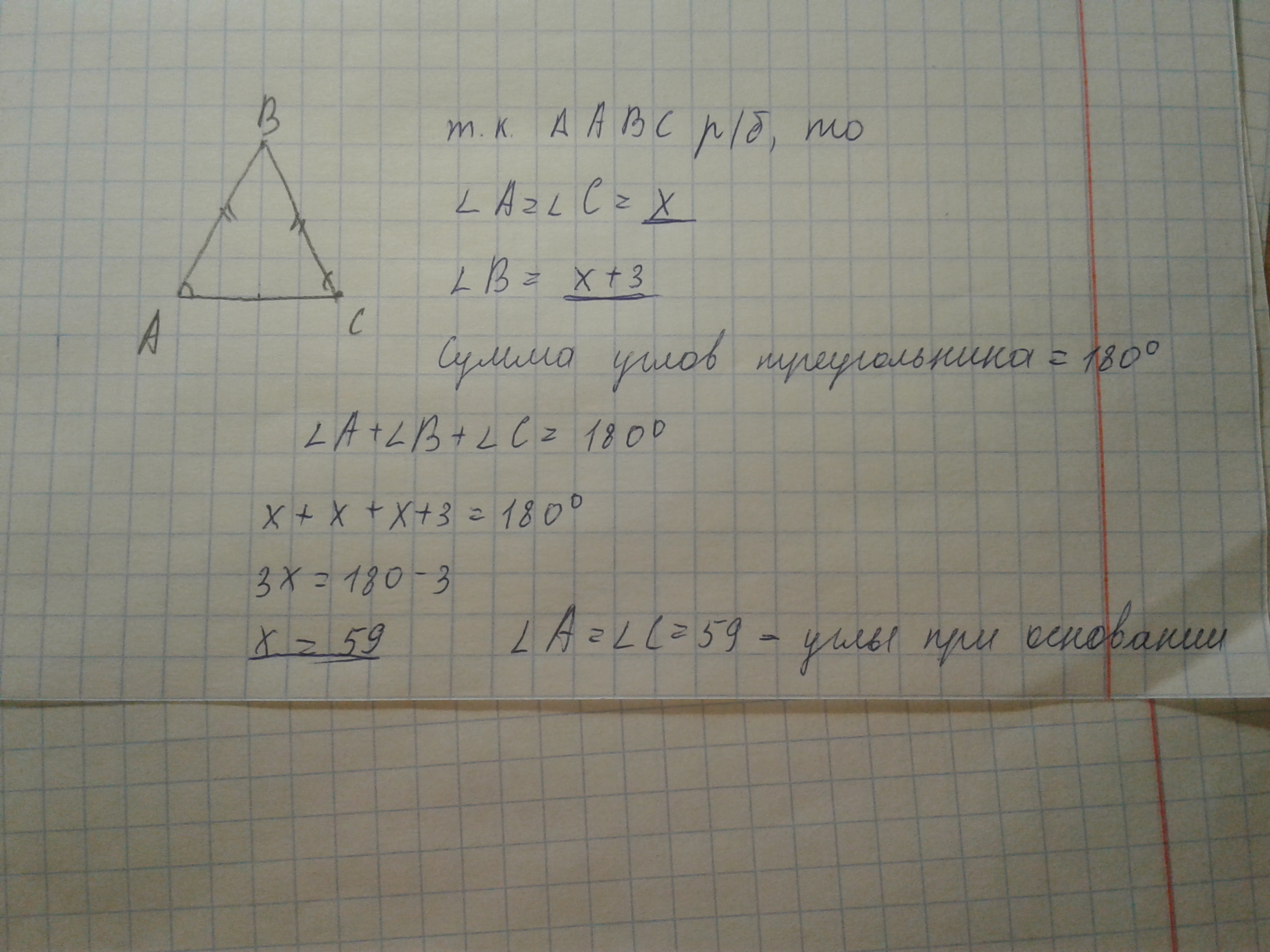 Если угол при вершине на 3° больше угла при основании, то в равнобедренном треугольнике угол при основании равен?