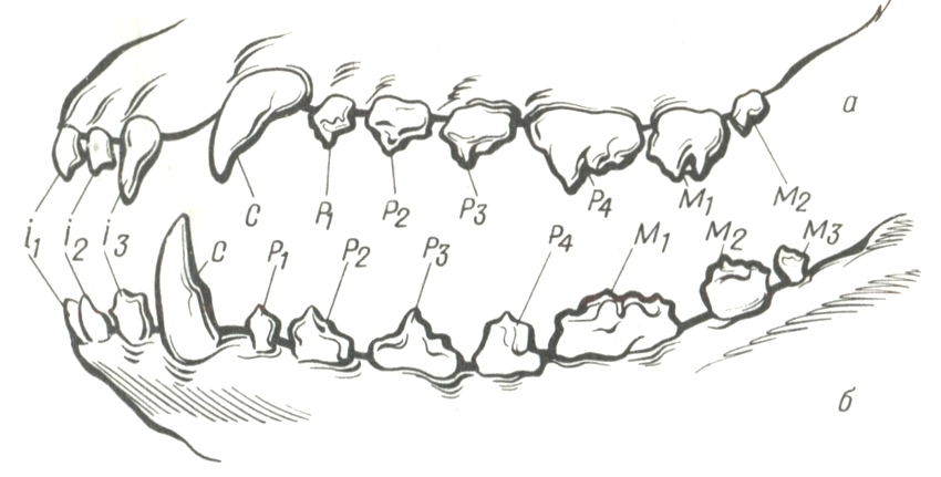 Соответствуя таким требованиям эволюция награждает их дифференцировкой зубов и вот такой зубной формулой I 3/3 C 1/1 P 4/4 M 2/3 = 42(зуба в целом)