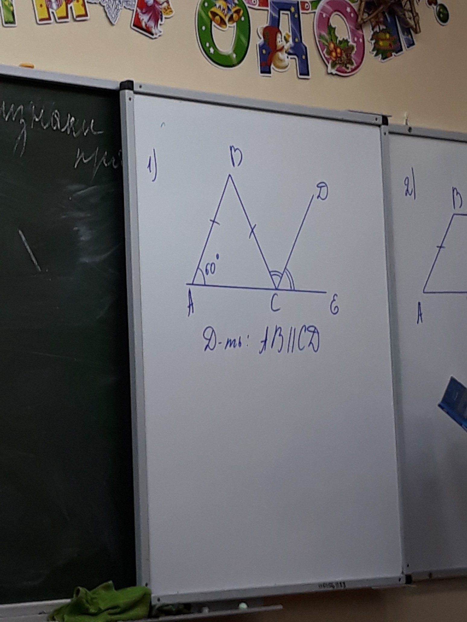 угол ВАС=угол ВСА как углы при основании равнобедренного треугольника. Угол ВСА и ВСЕ смежные, значит ВСЕ=180-60=120 .ВСД=ДСЕ по условию, значит ВСД=ДСЕ=120/2=60. Тогда ВАС=ДСЕ, а они являются соответственными при АВ и СД, АС -секущая. Соответственные углы равны значит прямые параллельны по второму признаку параллельности прямых