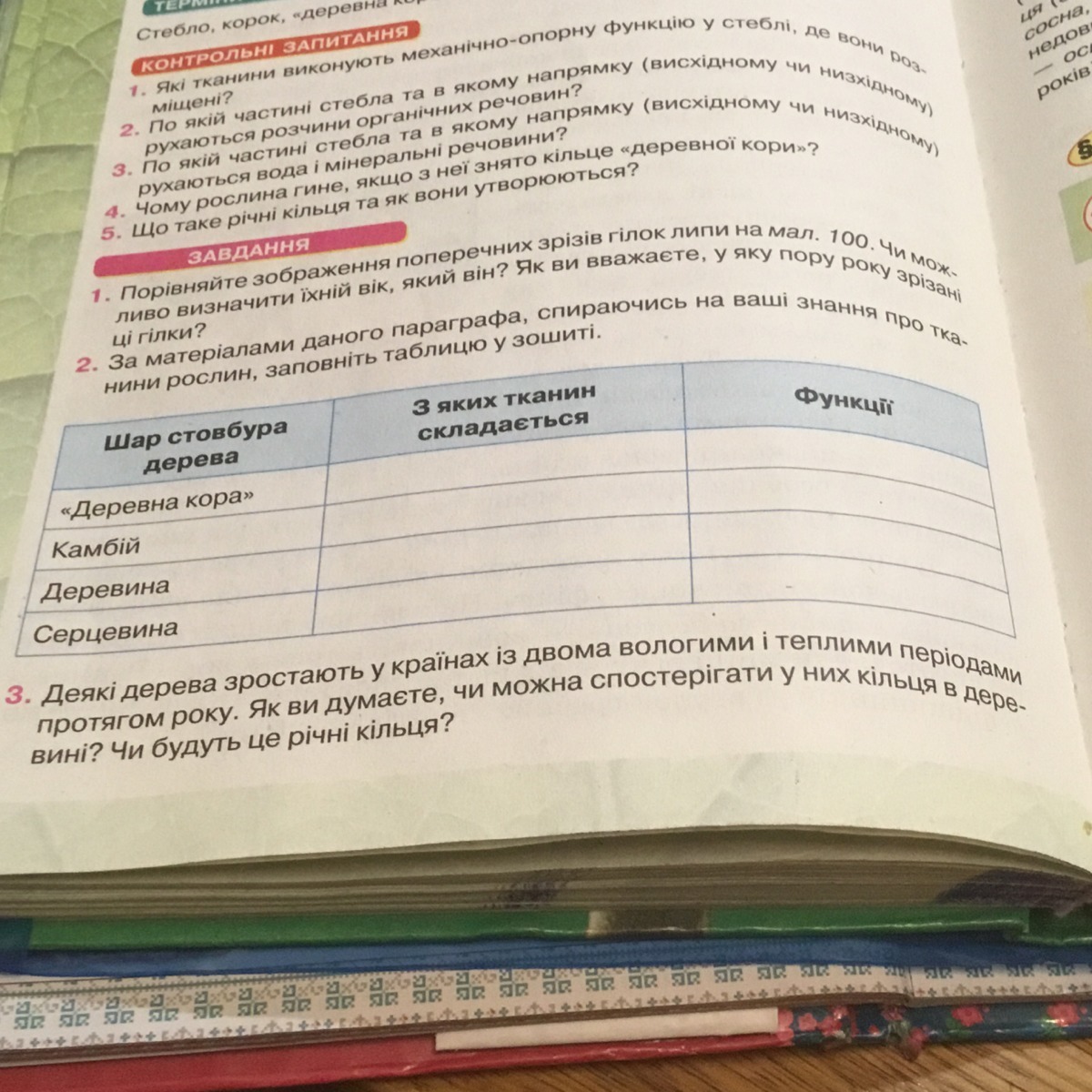деревина : складаеться з механiчной та основной тканi, функцiï : образовання годiчних колець, проводження мiнеральных речовин.