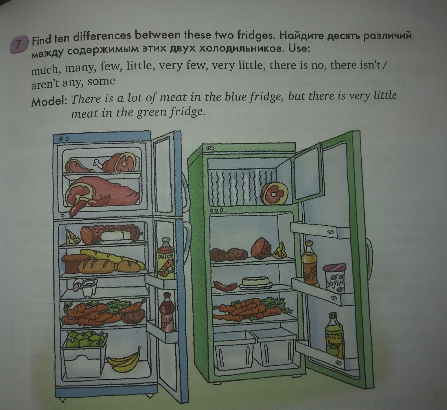 Просто сравни два холодильника. На одном много мясо на одном немного, на одном много фруктов на одном нет. Лучше воспользуйся переводчиком)