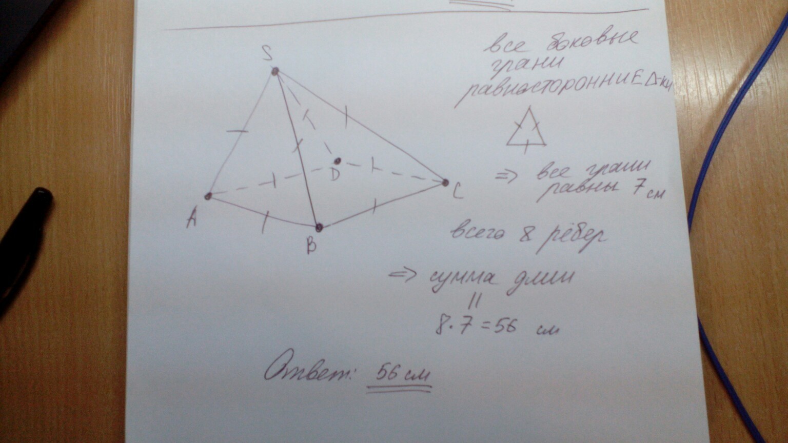 на рисунке 21 изображена пирамида SABCD, боковые грани которой-равносторонние треугольники со стороной, равной 7 см. Чему равна сумма длин всех рёбер пирамиды?