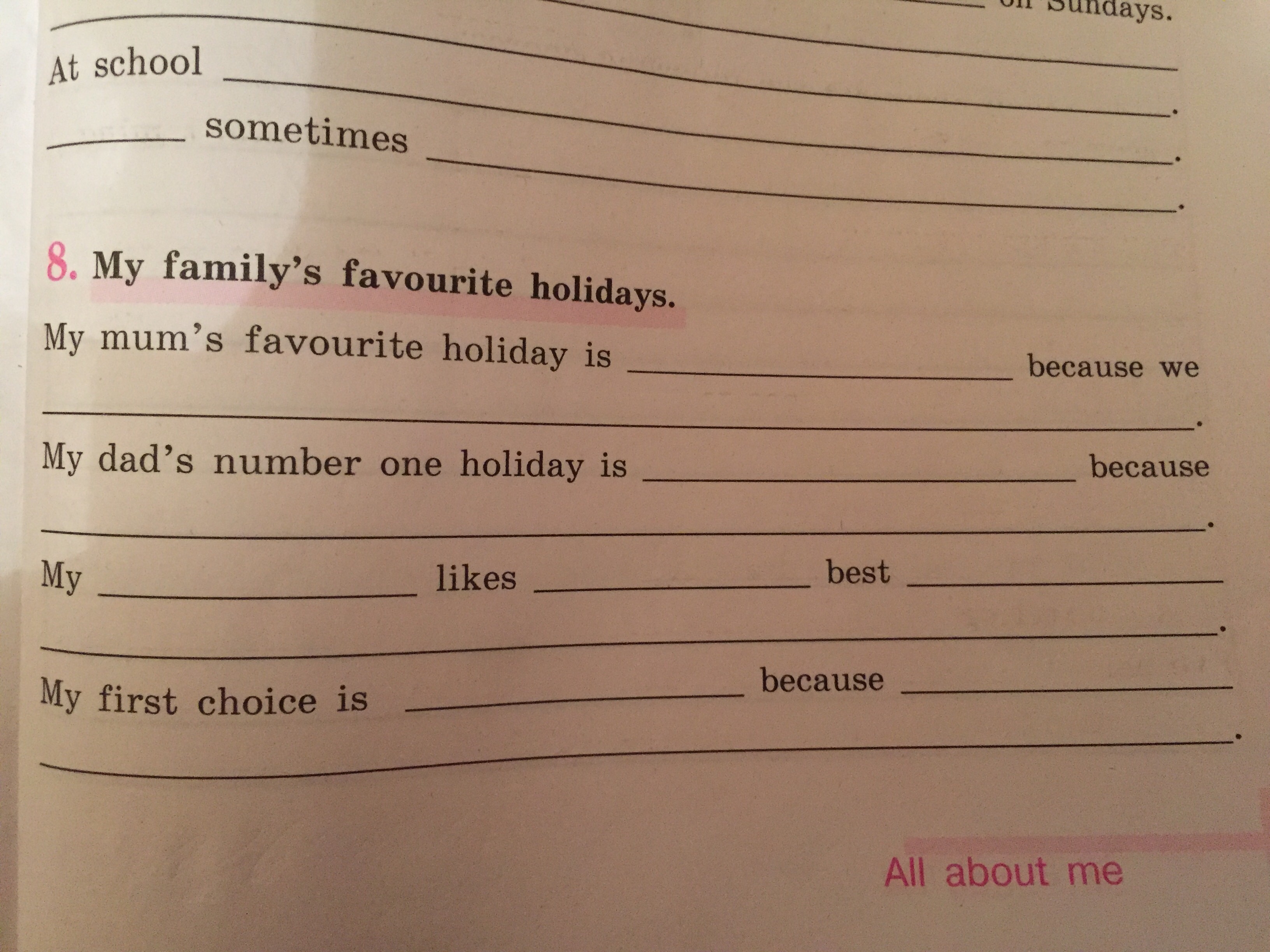 My mum's favourite holiday is The New Year's Day_because we celebrate it with our grandmother and grandfather and other relatives_. My dad's number one holiday is _the twenty-third of February_ because _our Granny and Mum always give him new socks and some other nice presents. My sister_ likes_ The eighth _of March_best of all. My first choice is _my birthday and the birthday of my mother because she is the best mother in the world.