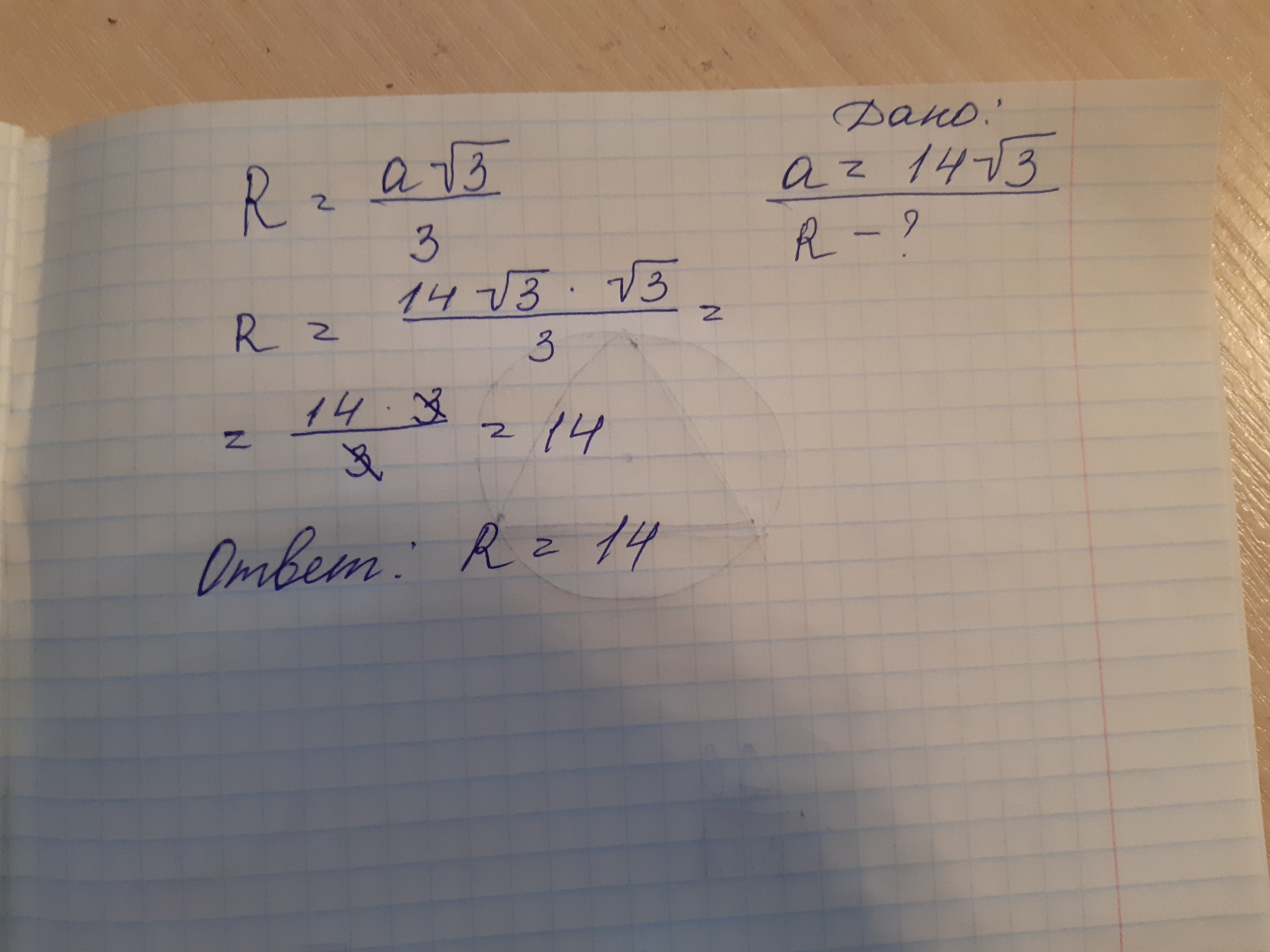 Сторона равностороннего треугольника равна 14√3.Найдите радиус окружности описанной около этого треугольника. СРОЧНО!!!