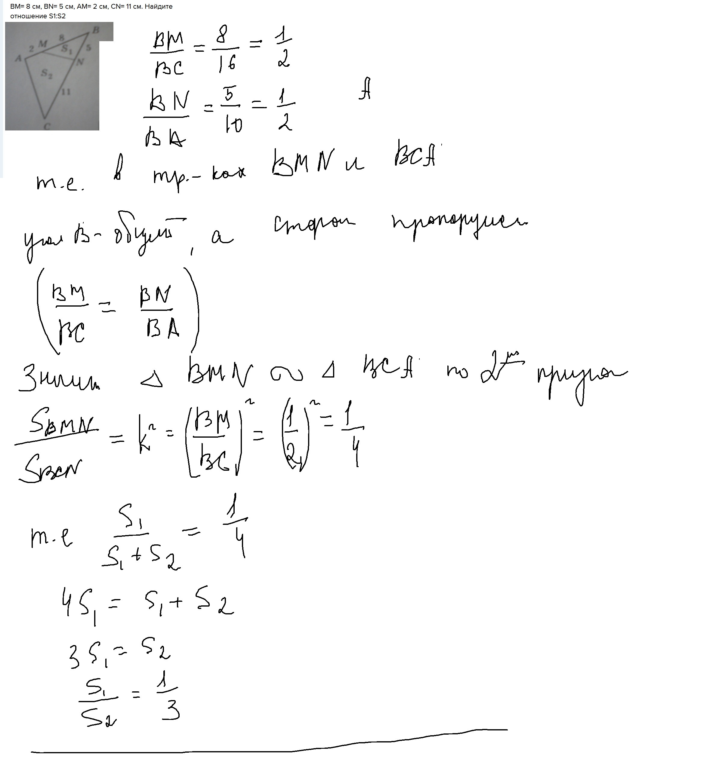 BM= 8 см, BN= 5 см, AM= 2 см, CN= 11 см. Найдите отношение S1:S2
