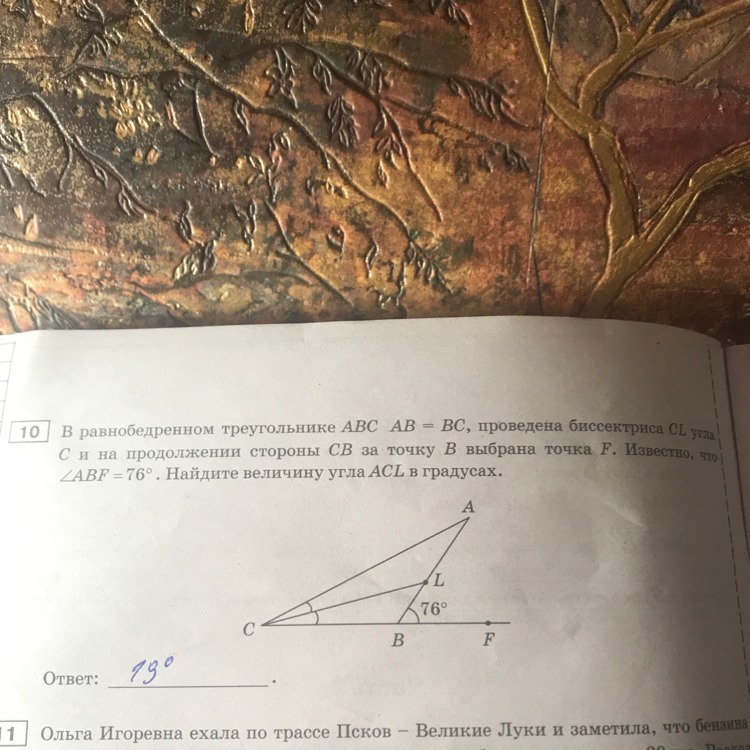 В равнобедренном треугольнике ABC AB=BC, проведена биссектриса CL угла C и на продолжении стороны CB за точку B выбрана точка F. Известно, что угол ABF=76 градусам. Найдите величину угла ACL в градусах.