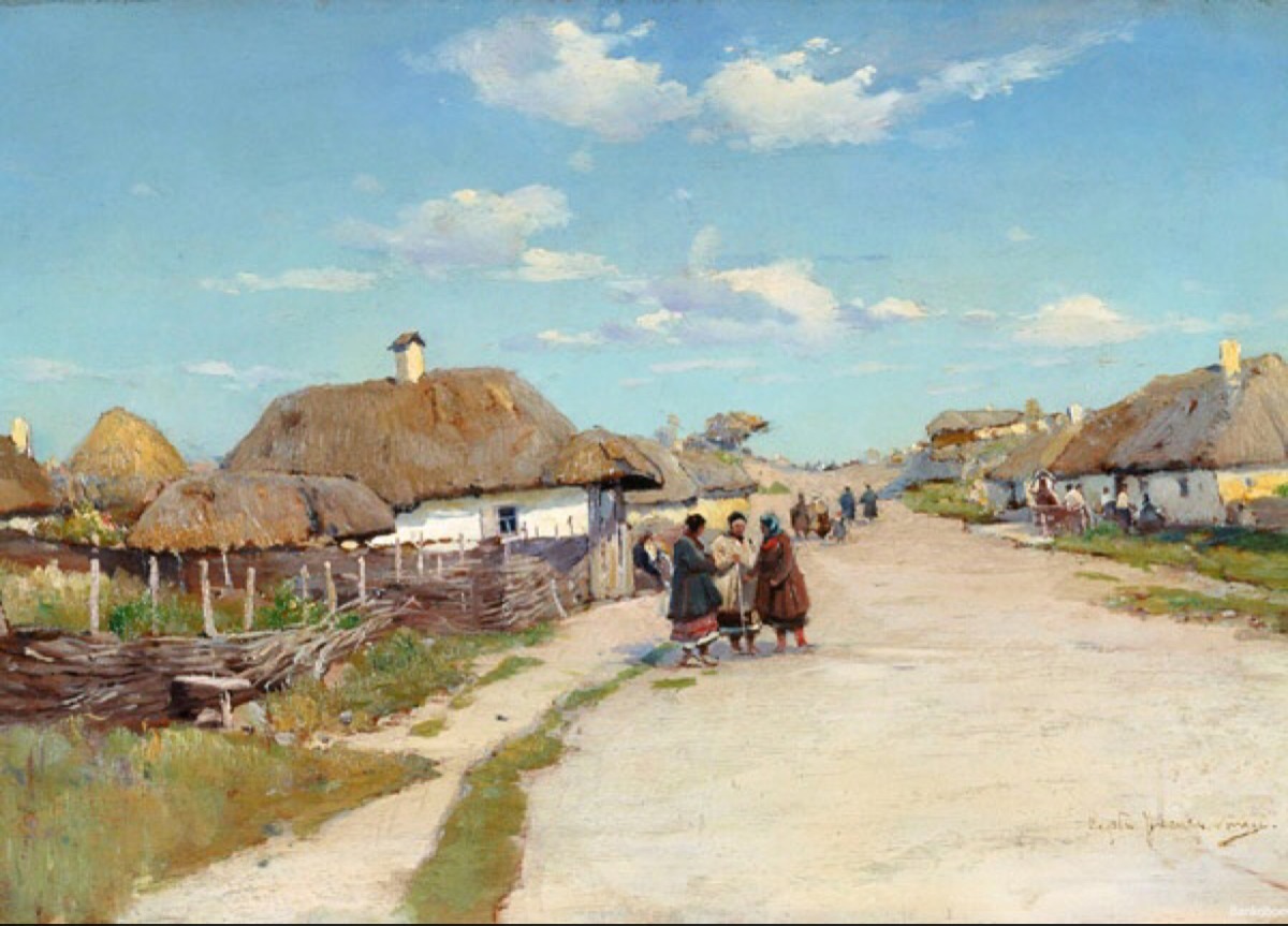 Ця картина зачаровуэ своею природою, вона немов дивится на нас зеленими очима, наповненими красою барв.Сільські люди посеред дороги доповнюють цій картині сільський настрій, адже в селі природа має свіже повітря.Маленькі хати на зеленому фоні дуже прикрашають картину.Небо ніби підлаштовується до настрою селян, які ходять по стежці, спілкуються, сміються та щось вирішують.Ця картина нагадує мені щасливе життя.