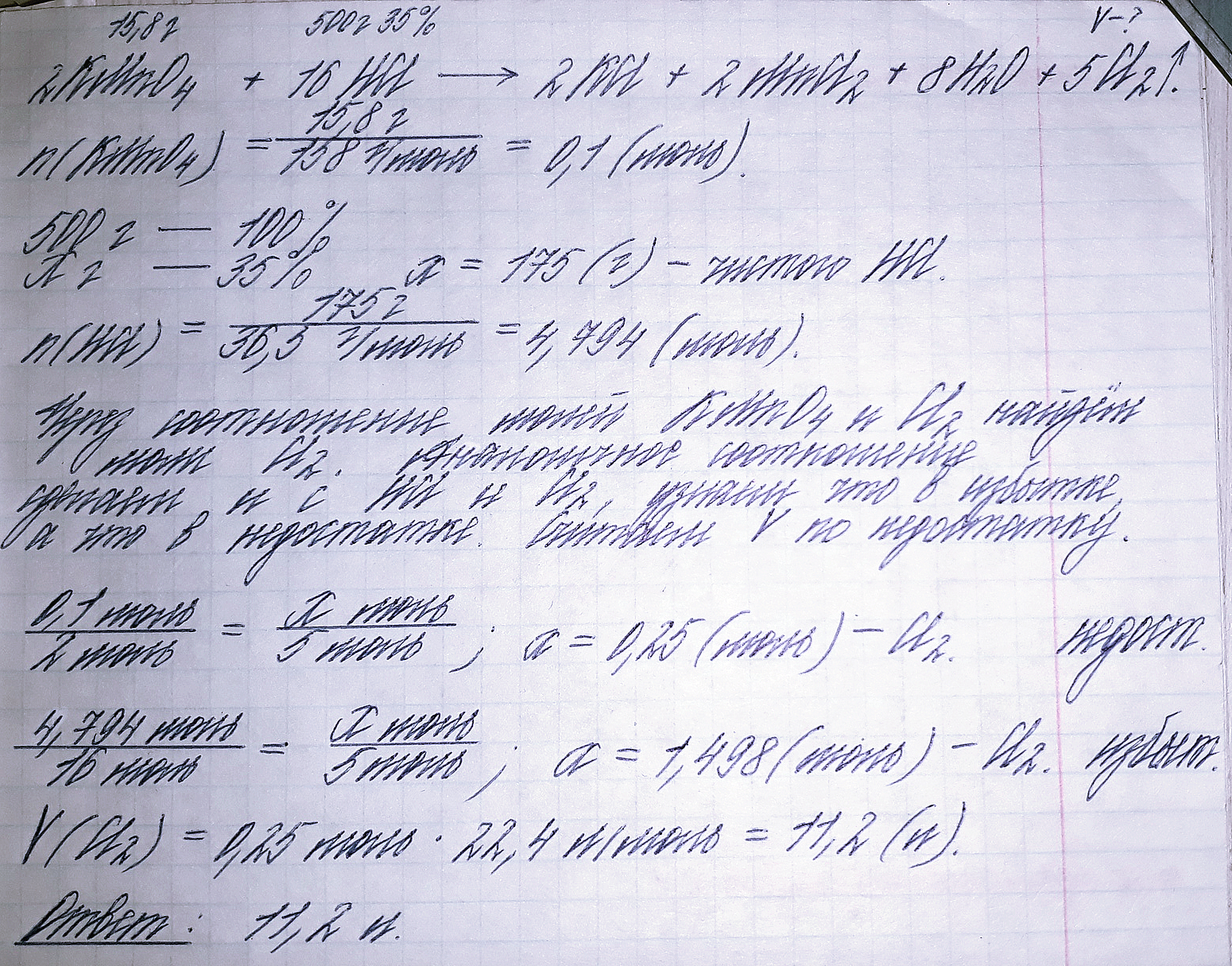 К 500 г раствора хлороводородной кислоты, содержащего 35% HCl добавили 15,8 г KMnO4. Какой объем (н.у.) займет газ, образовавшийся в реакции? Сколько молей и каких веществ находится в окончательном растворе?