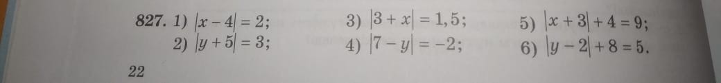 1);|x-4|=2\begin{cases}x-4=2\x-4=-2end{cases}Righatrrowbegin{cases}x_1=6\x_2=2end{cases}\2);|y+5|=3\begin{cases}y+5=3\y+5=-3end{cases}Rightarrowbegin{cases}y_1=-2\y_2=-8end{cases}\3);|3+x|=1,5\begin{cases}3+x=1,5\3+x=-1,5end{cases}Rightarrowbegin{cases}x_1=-1,5\x_2=-4,5end{cases}\4);|7-y|=-2;-;pew.;HET\5);|x+3|+4=9\|x+3|=5\begin{cases}x+3=5\x+3=-5end{cases}Rightarrowbegin{cases}x_1=2\x_2=-8end{cases}\6);|y-2|+8=5\|y-2|=-3;-;pew.;HET.