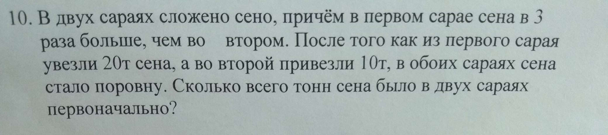 первом 3х. После того как увезли и привезли стало 3х-20=х+10