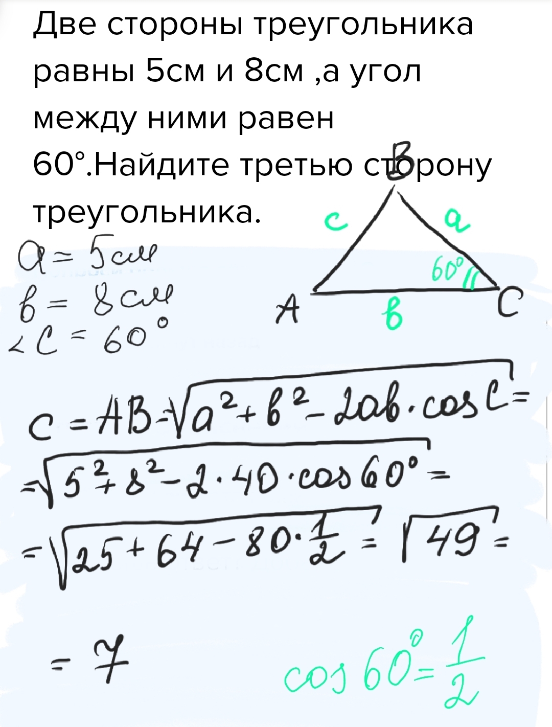 Две стороны треугольника равны 5см и 8см ,а угол между ними равен 60°.Найдите третью сторону треугольника.