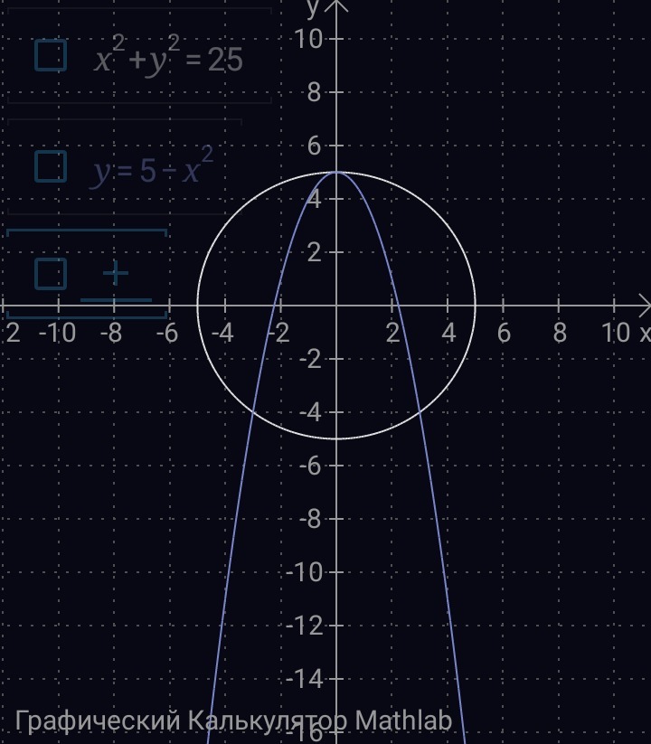 Чертите координатный оси. Первое уравнение это урав. окружности с центром (0;0) и радиусом r=5. Напишите это около уравнения. Около второго напишите : парабола, ветви вниз, с вершиной (0;5). Изобразите все это. Циркулем окружность. Параболу по точкам. Первая общая точка это (0;5). Две вторые (-3;-4) и (3;-4). Эти три точки пересечения параболы и окружности будут ответом.