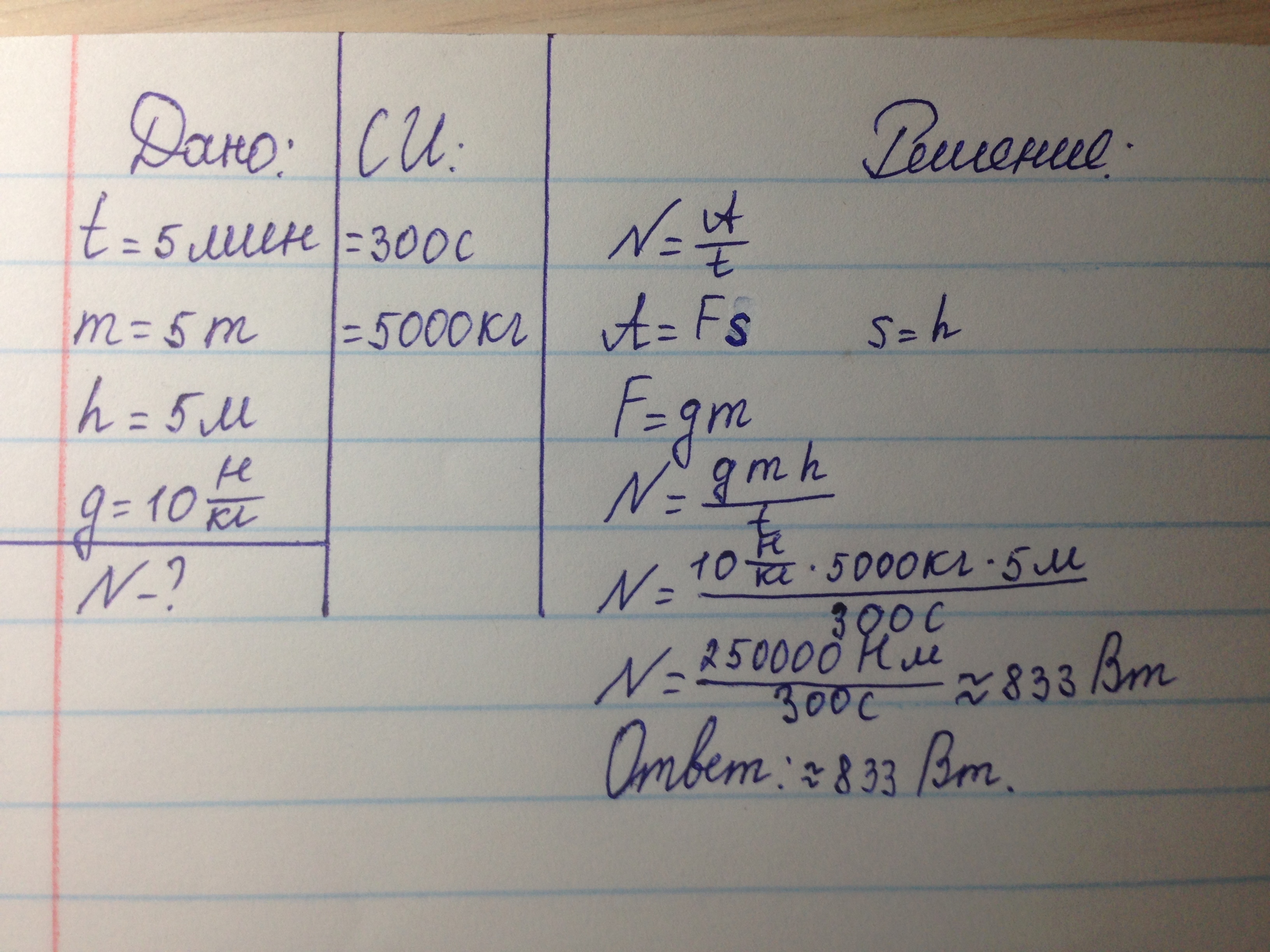 определите мощность насоса который поднимает воду массой 5 тонн на высоту 5 метров за 5 минут срочно́ооооооооооо помогите пожалуйста