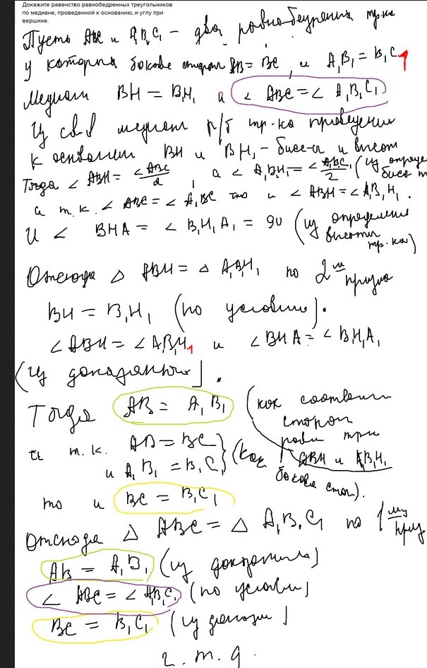 Докажите равенство равнобедренных треугольников по медиане, проведенной к основанию, и углу при вершине. Пожалуйста можно с чертежом.