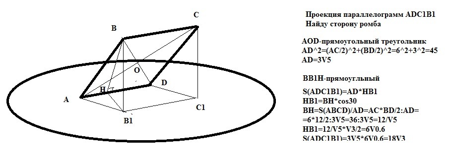 Срочно !!! Через одну из сторон ромба, диагонали которого равны 6 см и 12 см, проведена плоскость a, образующей с плоскостью ромба угол 30 °. Найдите площадь проекции данного ромба на плоскость a. Буду очень признательна !