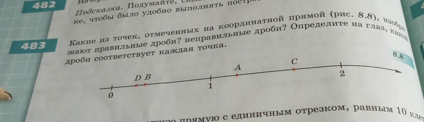 Какие из точек, отмеченных на координатной прямой рис. 8.8., изображают правельные дроби? неправельные дроби? Определите на глаз, какой дроби соответствует каждая точка. (длина прямой 11,7 см)