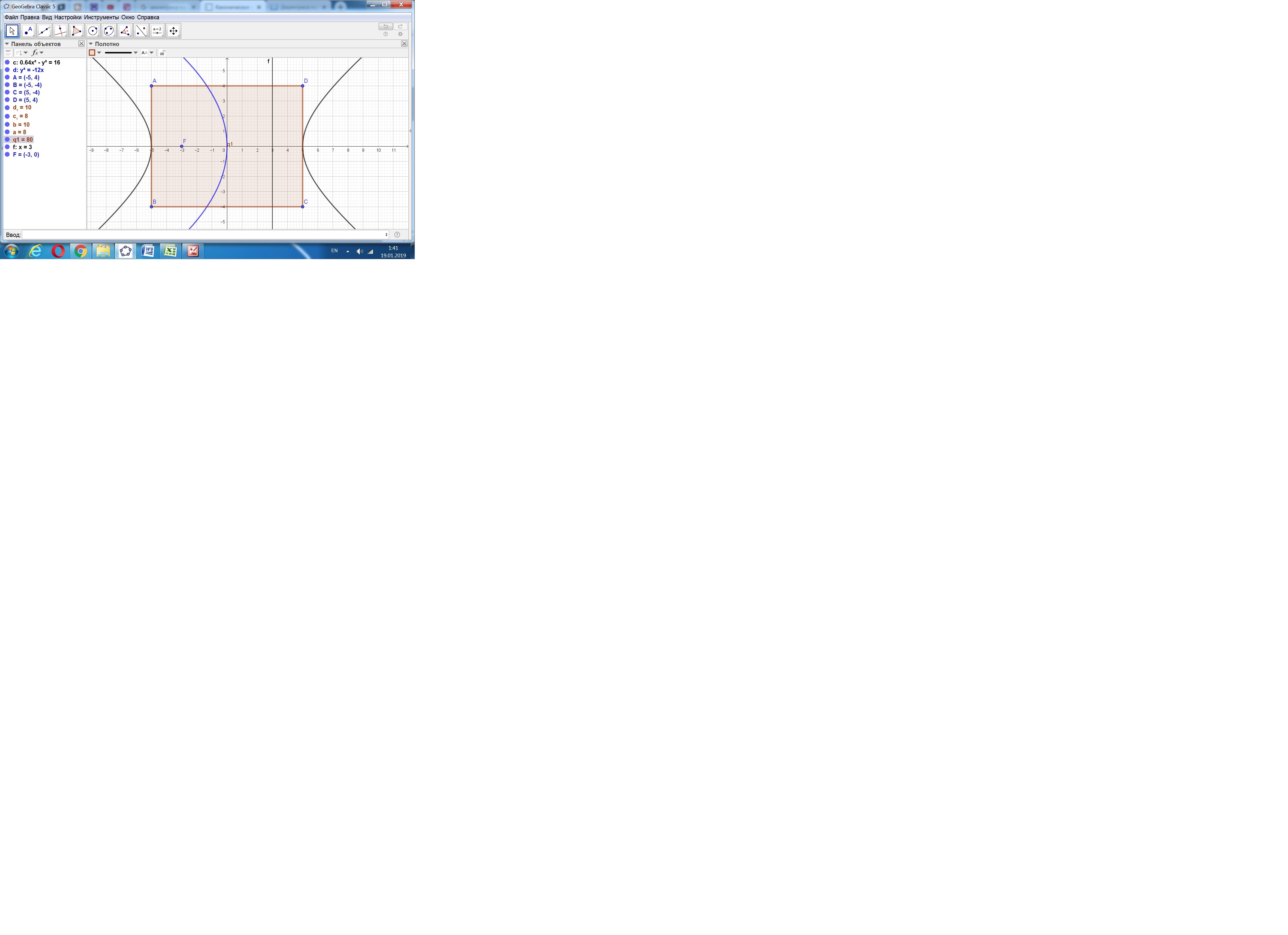 Отсюда у гиперболы а = 5, в = 4. Прямоугольник 2*5 х 2*4 = 80 кв.ед.