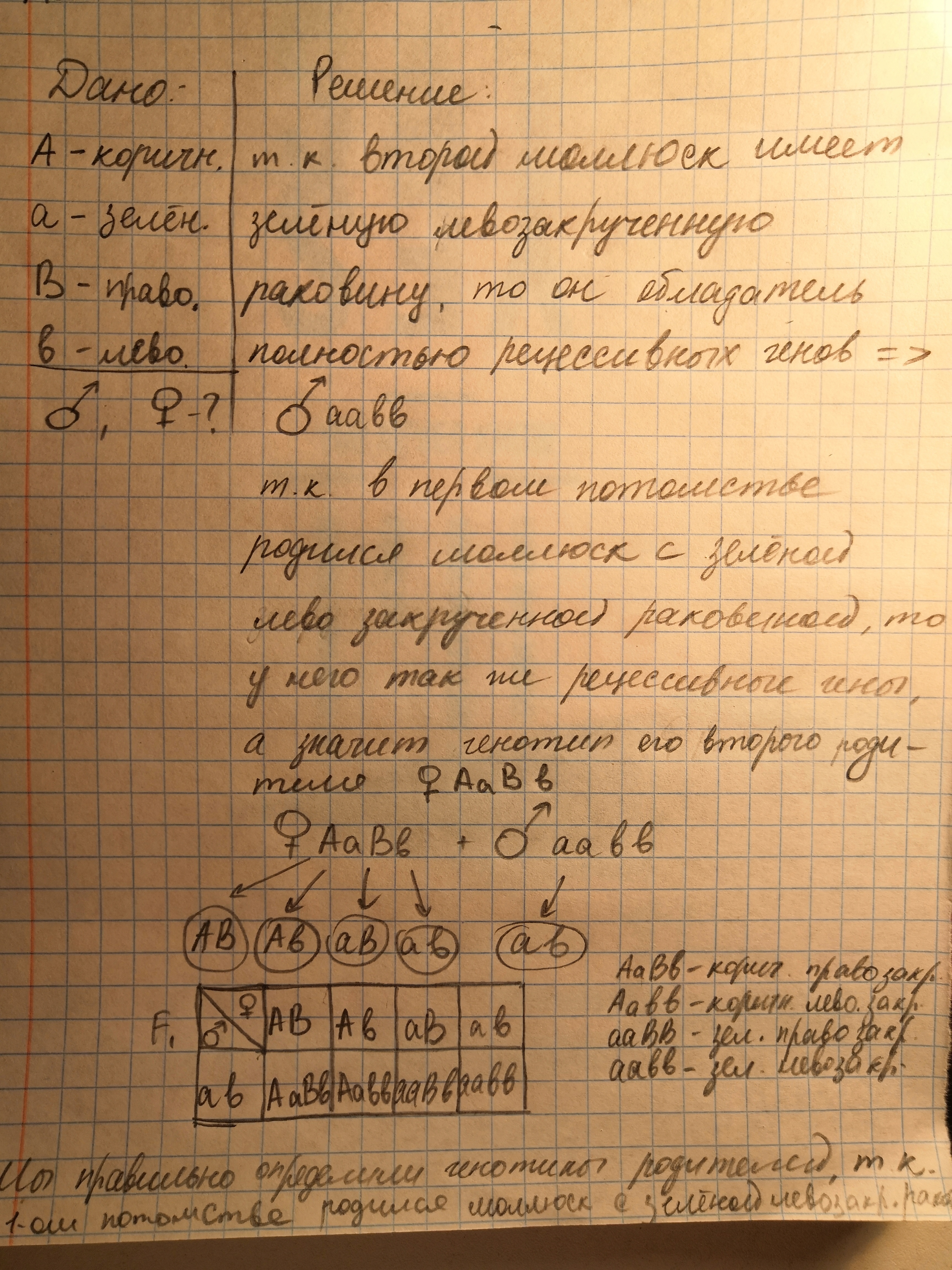 Ответ: у первого моллюска генотип АаВв, а у второго аавв. Решение смотри на фото