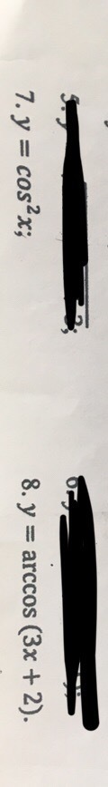 7)y =  cos ^{2} (x)  \  frac{d}{dx} ( cos ^{2} (x) ) = 2 cos(x)  times ( -  sin(x))  =  - 2 sin(x)  cos(x)  =  \  =  -  sin(2x)