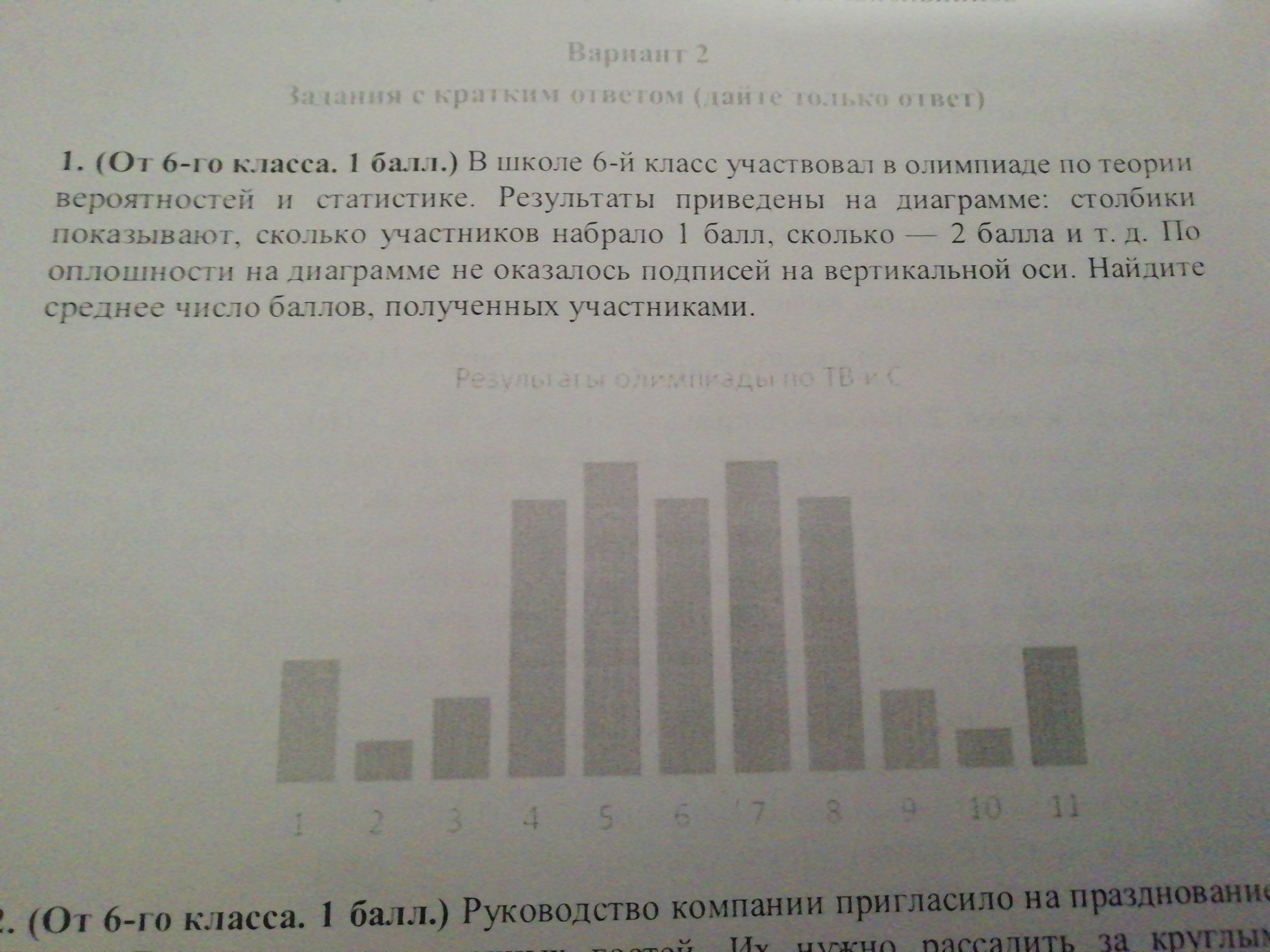 в школе 6 й класс участвовал в олимпиаде по теории вероятностей и статистике. Результаты приведены на диаграмме:столбики показывают, сколько участников набрало 1 балл, сколько-2 балла и т. д. По оплошность на диаграмме не оказалось подписей на вертикальной оси. Найдите среднее число баллов, полученных участниками