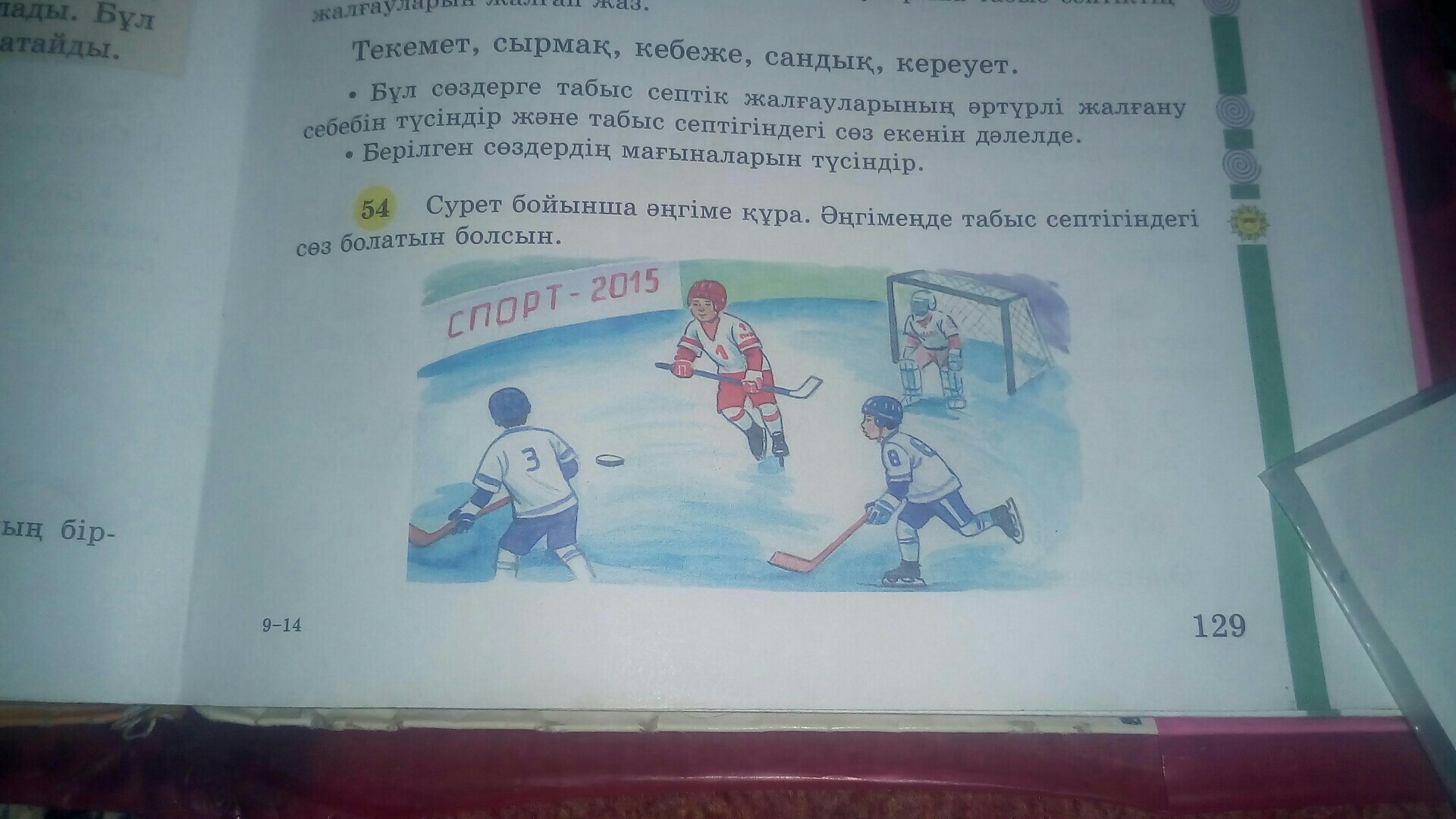 Балалар хоккей ойнады.Алмас хоккейді тепті, сосын хоккей какпаға тиді.Айбек Алмасты итеріп жіберді, бірақ Алмас қайта тұрып ойнады.Алмас және оның тобы хоккей ойнаудан жеңді