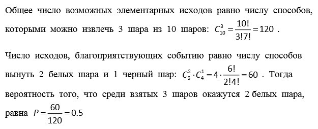 В урне 6 белых и 4 черных шара. Из этой урны наудачу извлекли 3 шаров. Какова вероятность того, что 2 из них белые