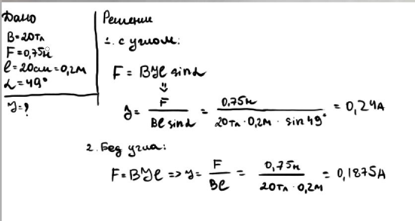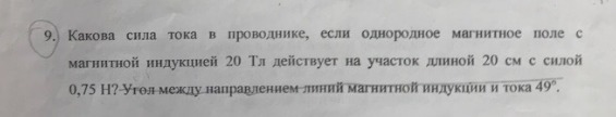 Какова сила тока в проводнике, если однородное магнитное поле с магнитной индукцией 20 Тл действует на участов длиной 20 см с силой 0,75 H Угол между направлением линий магнитной индукции и тока 49 градусов