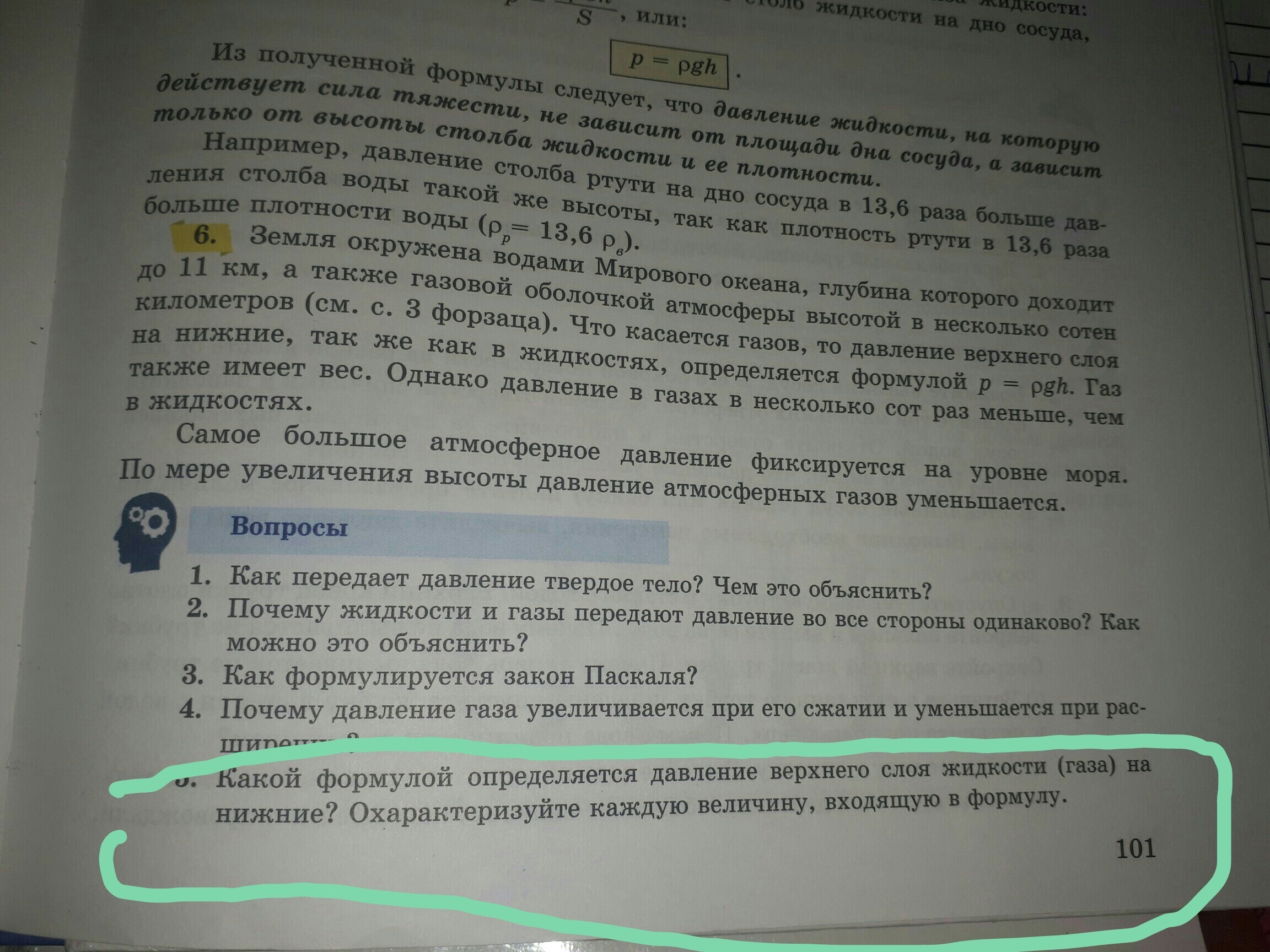 какой формулой определяется давление верхнего слоя жидкости (газа) на нижние?Охарактеризуйте каждую величину входящую в формулу