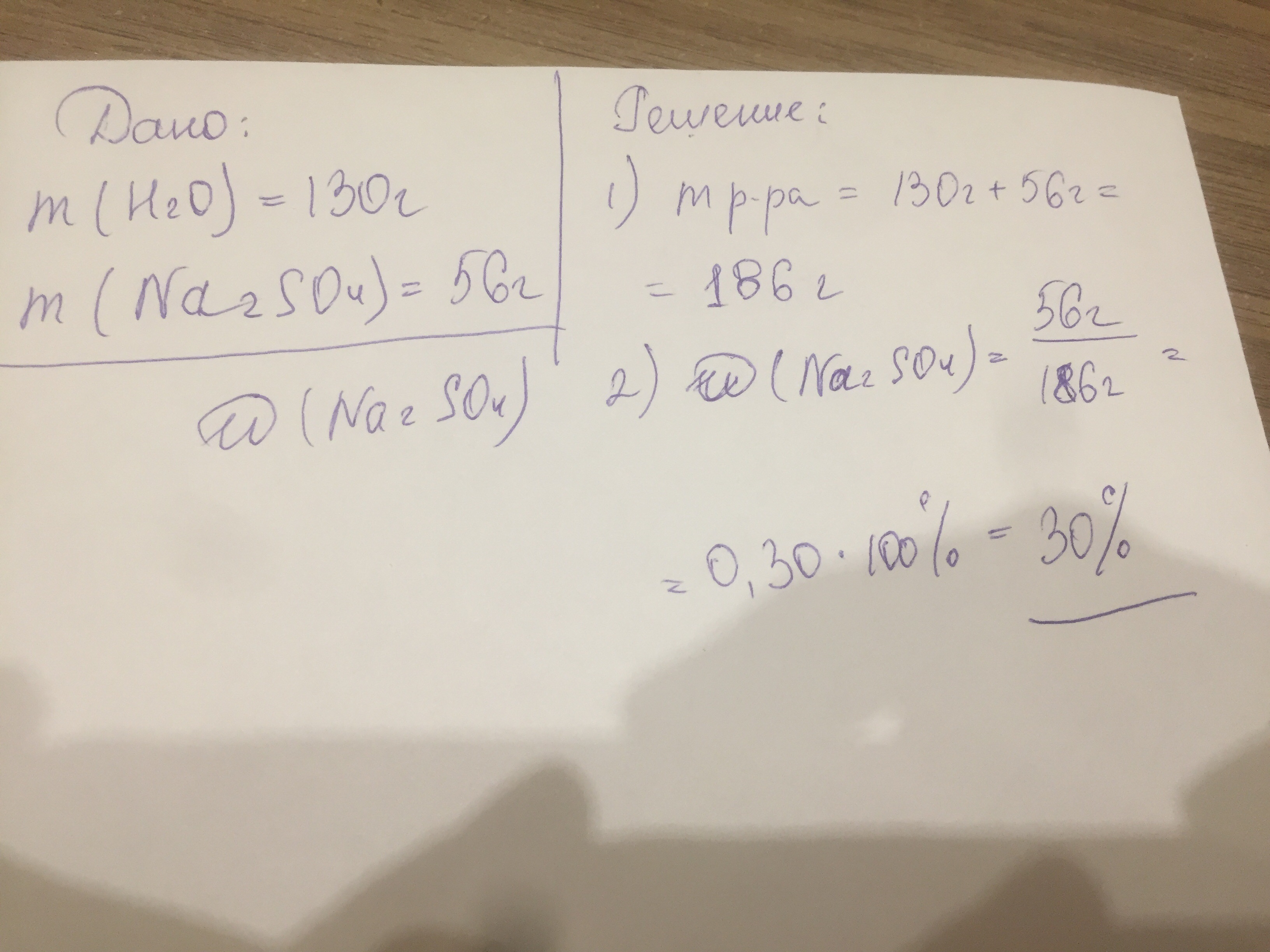 В 130 г воды растворили 56 г сульфата натрия. Вычислите массовую долю сульфата натрия в растворе. Ответ дайте в процентах с точностью до сотых