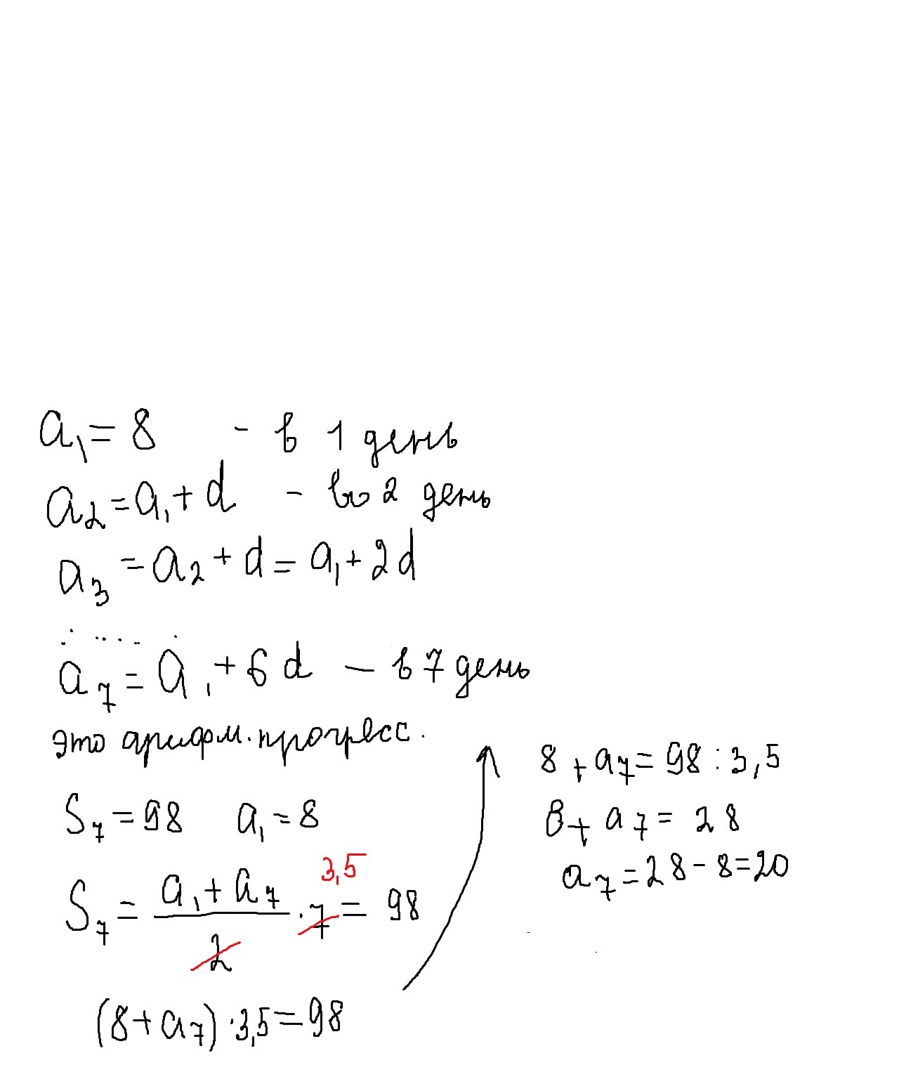 т.к Вася решал больше задач на одно и тоже количество каждый день,то получаем арифметическую прогрессию,А1=8 и суммма восьми первых членов равна 98.Решаем и получаем,что в последний 7 день он решил 20 задач.