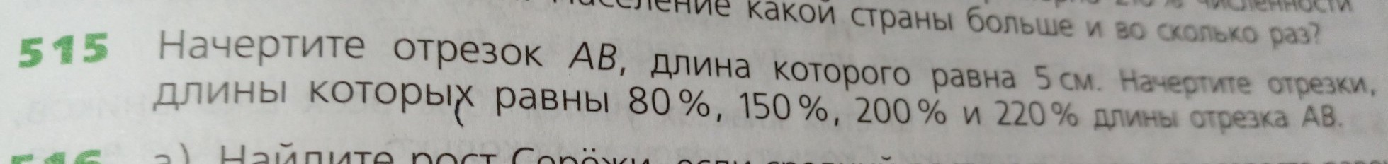 Тебе дан отрезок(5см) тебе нужно найти 80% и другие от него вот как это делается : всего у любого предмета есть 100% (если в задаче нажно найти 200% нужно прибавить ещё 100% чтобы получить 200% тоесть умножить число на два)так вот делим 5см на 100 будет 0,05 см тоесть 1 процент теперь умножай на коли чествовали процентов которое нужно найти тоесть например на 80 получится 4см это мы нашли 80% по этой схеме найти нужно и остальное