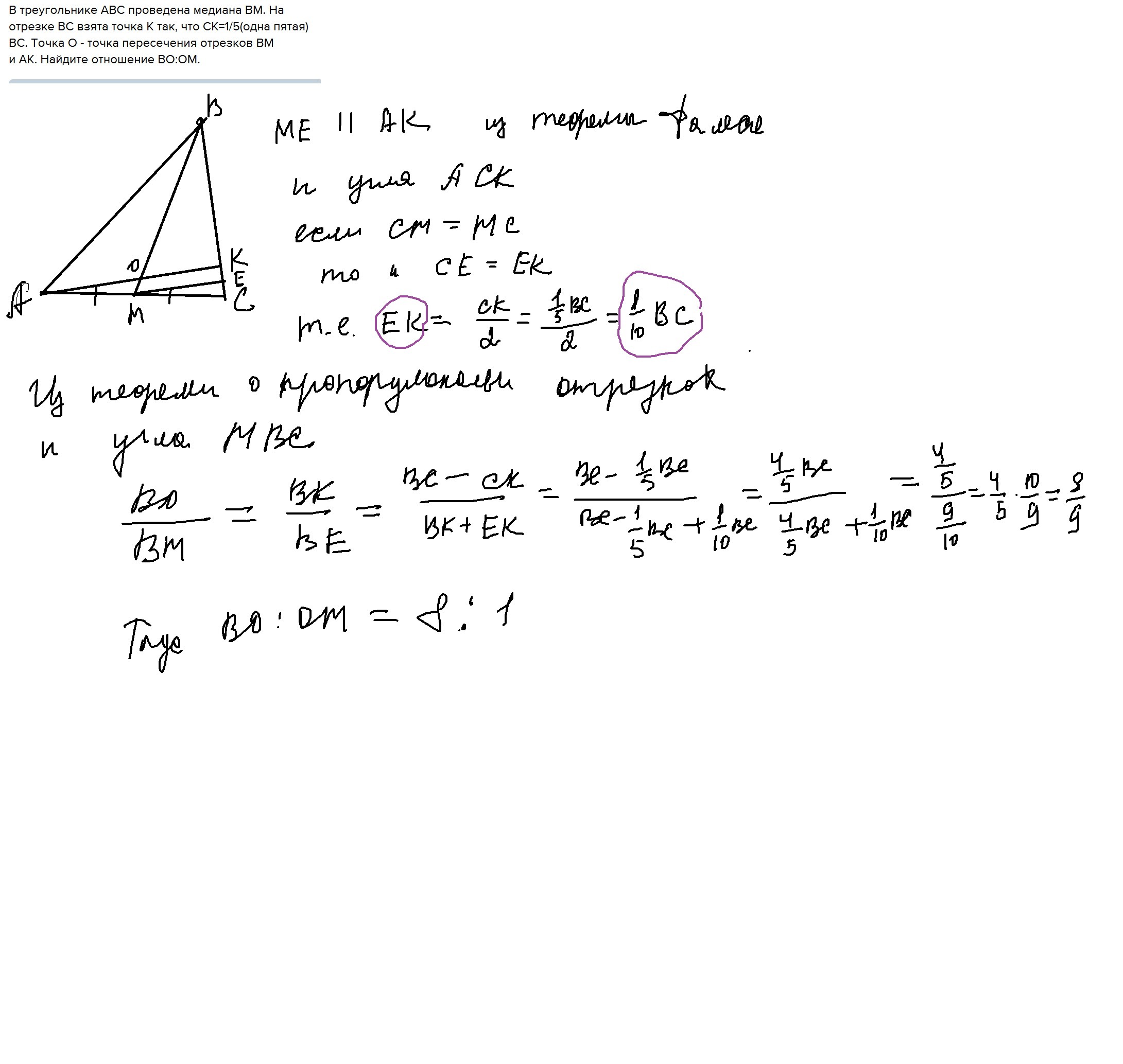 В треугольнике ABC проведена медиана BM. На отрезке BC взята точка K так, что CK=1/5(одна пятая) BC. Точка O - точка пересечения отрезков BM
