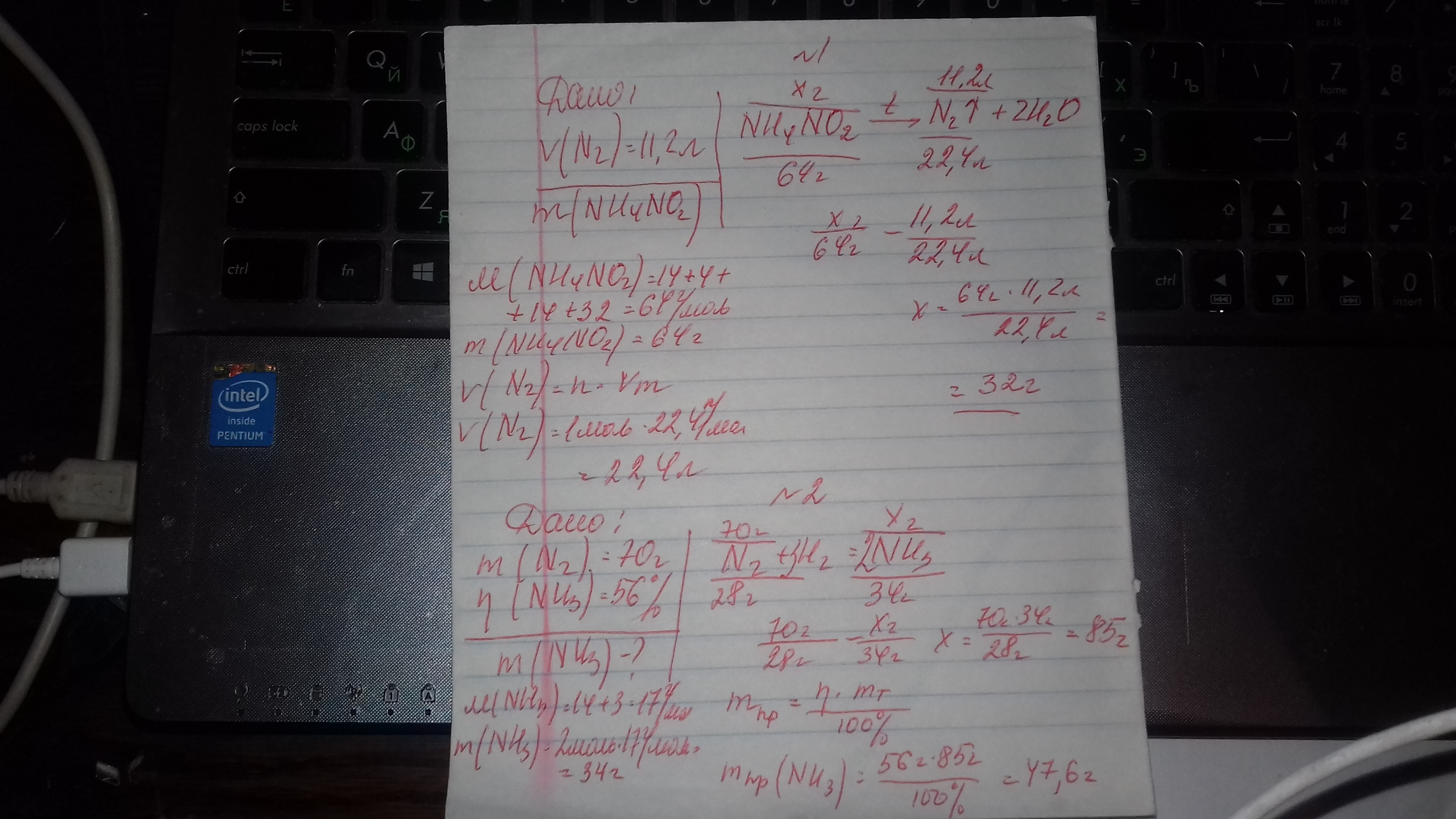 Рассчитайте массу нитрита аммония, который необходим для получения 11,2л азота. Какая масса аммиака образуется при взаимодействии 70 г азота с водородом, если выход аммиака равен 56 % ?