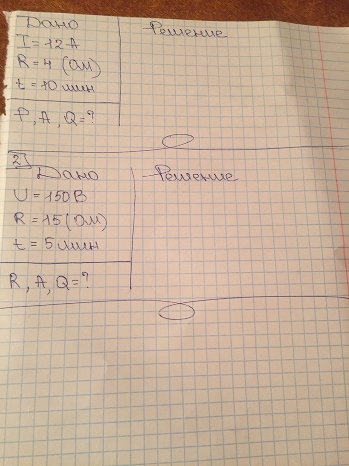 Стоит начать с первого задания. Решается оно следующим образом. Для того чтобы найти мощность, нужно силу тока возвести в квадрат и умножить на сопротивление. 576 Вт. Для нахождения работы нужно умножить число 576 на 600 (надеюсь, понятно почему). Получится 3456 килоджоулей. Далее требуется найти заряд. Находится он следующим образом: нужно силу тока умножить на секунды. Получаем 7200 Кл.